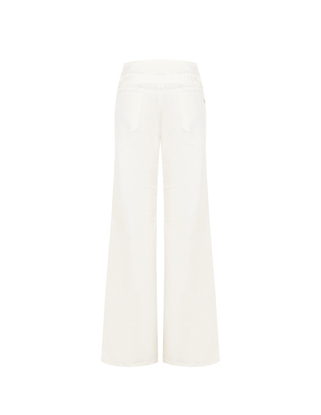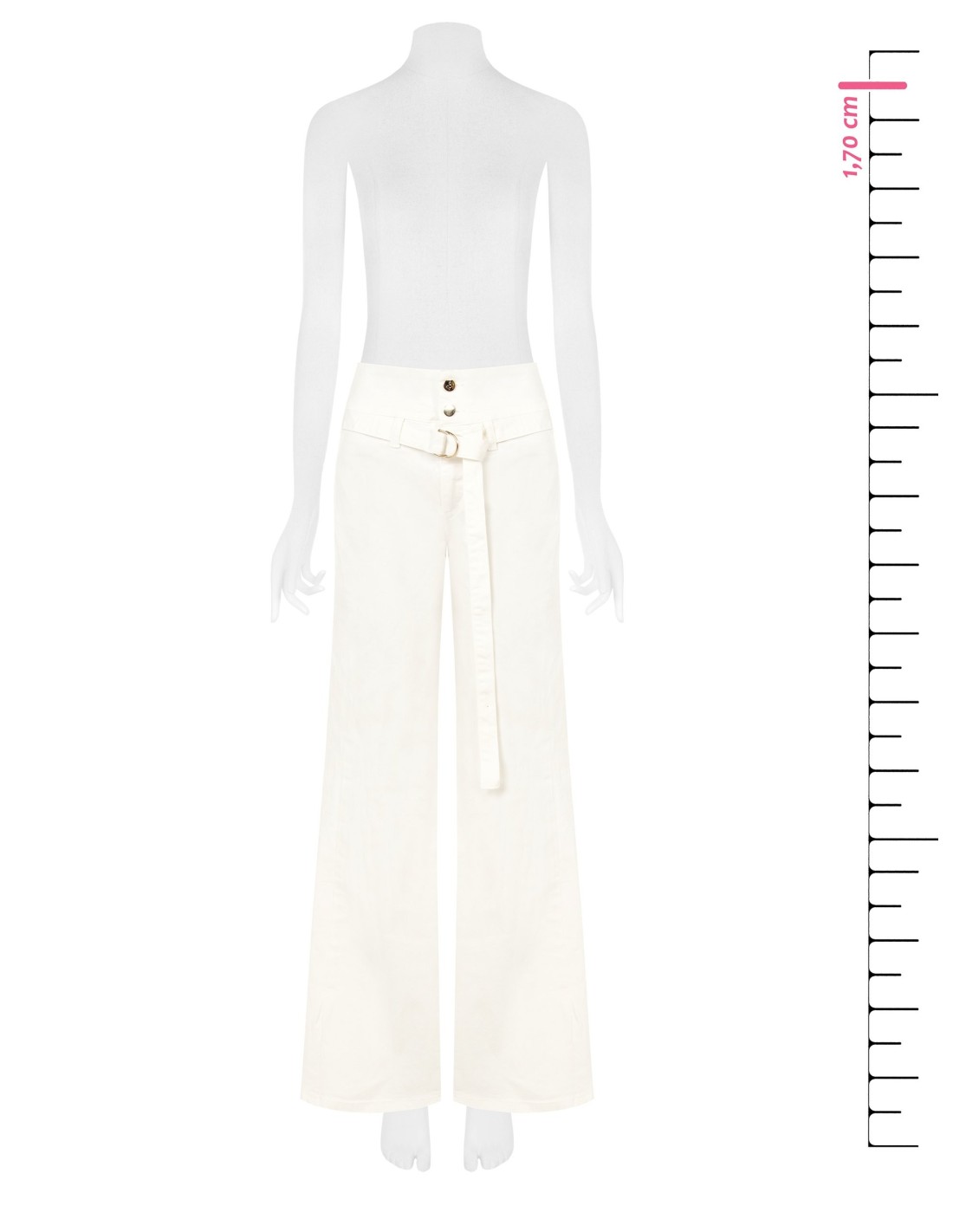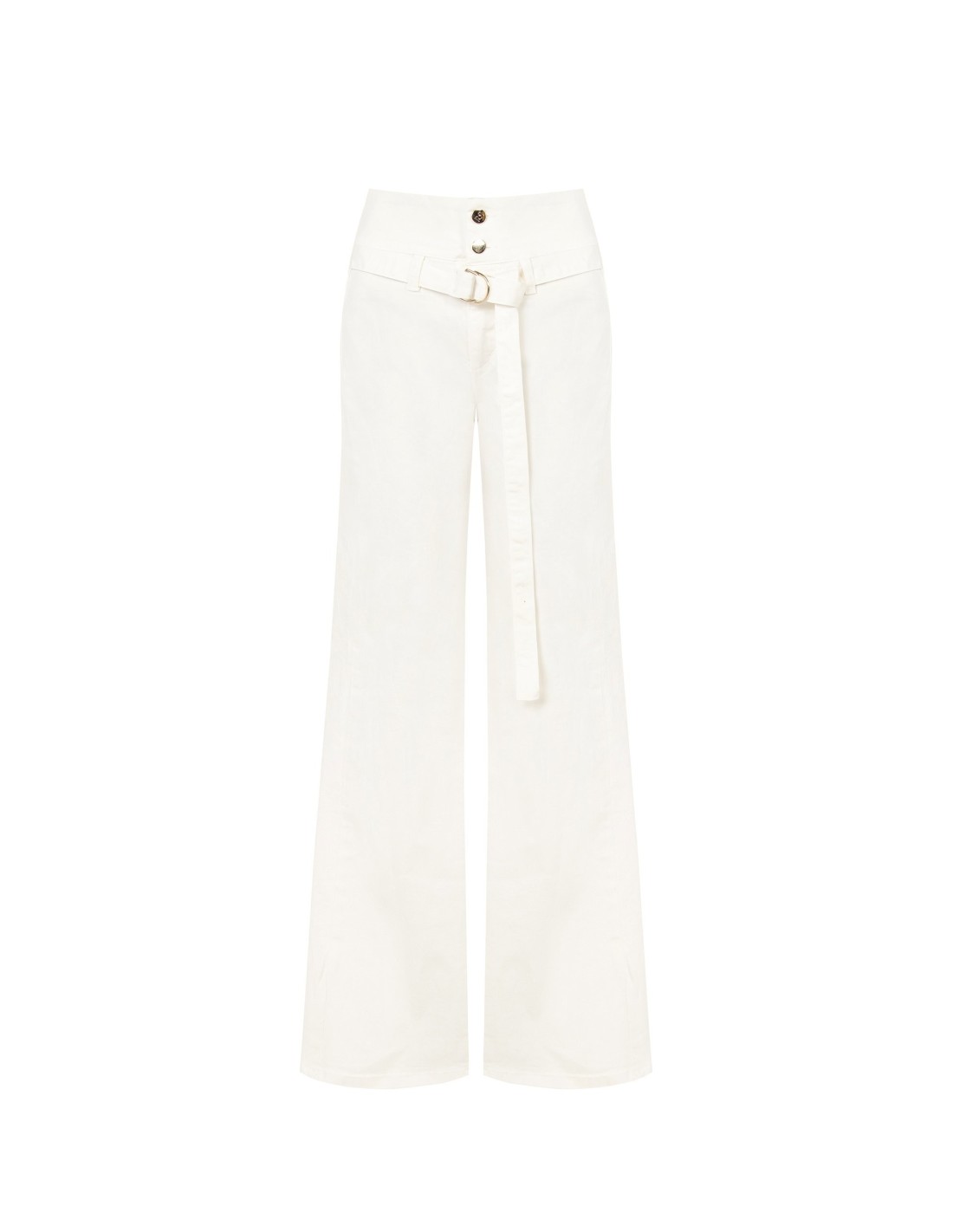 Calças de perna ampla em denim macio e ligeiramente elasticizado, que alongam a silhueta sem renunciar ao conforto. Cintura alta valorizada por cinto coordenado com fivela metálica e dois botões joia. Perfeitas do escritório ao aperitivo, com blazer ou tops femininos.