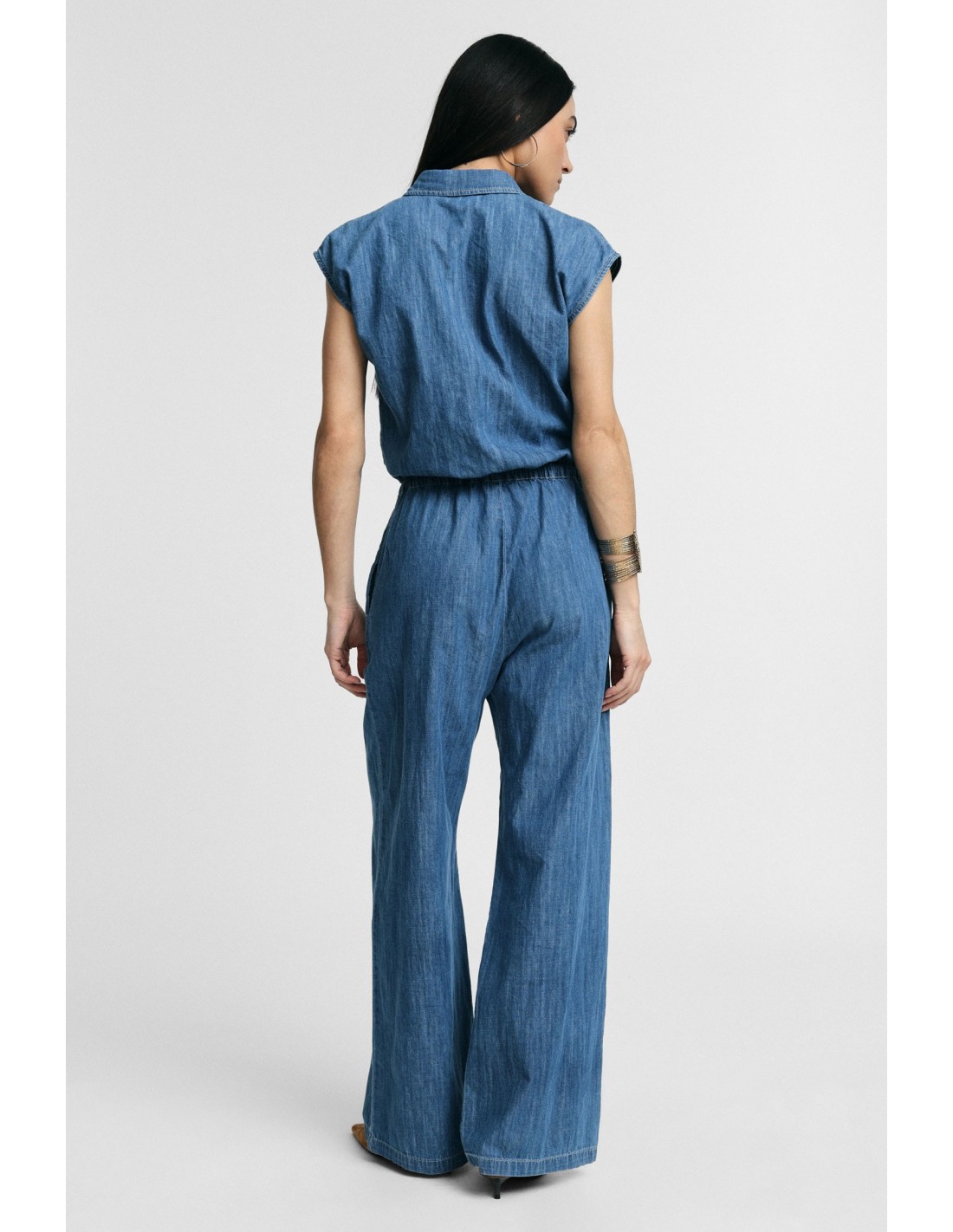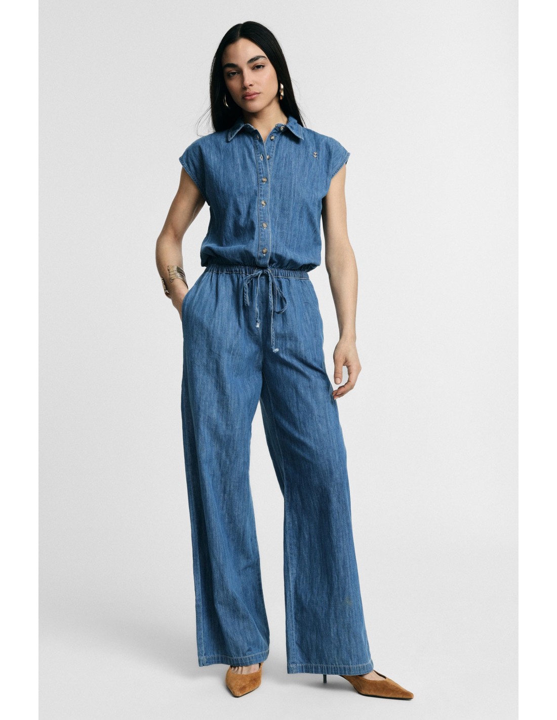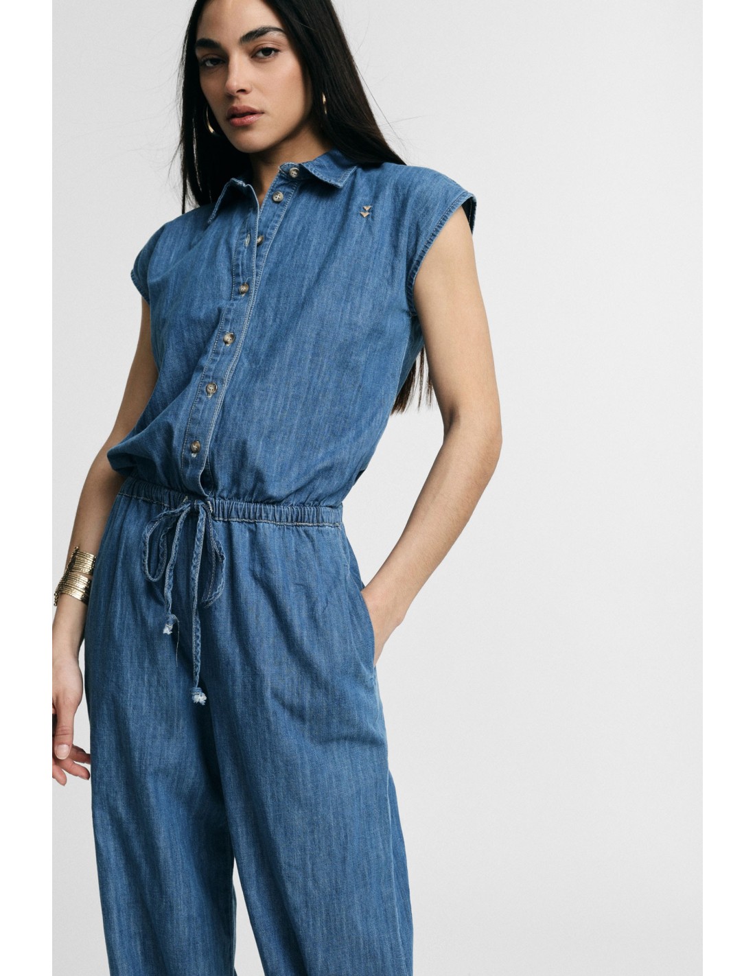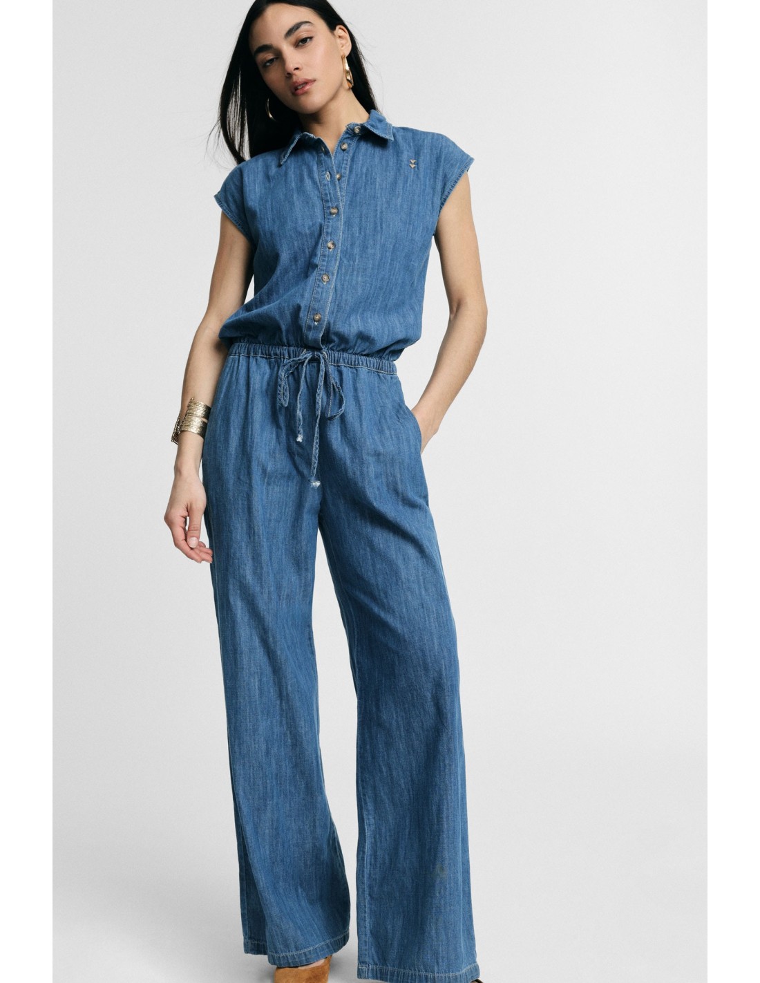 Um macacão sem mangas com corte relaxed e calças palazzo amplas, perfeito para se deslocar na cidade com conforto e estilo. A gola clássica e o fecho de botões conferem um toque elegante, enquanto o cordão ajustável valoriza a silhueta. Ideal para personalizar o seu look todos os dias.