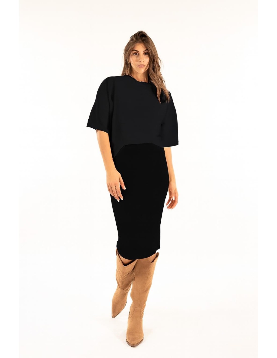 Saia midi em malha Kontatto de corte justo mas confortável graças à estrutura elástica. Textura macia e compacta que envolve a silhueta. Cintura subida com faixa em canelado e pequena abertura na parte de trás para liberdade de movimento. Perfeita do escritório ao aperitivo, com botas ou sapatos de salto.