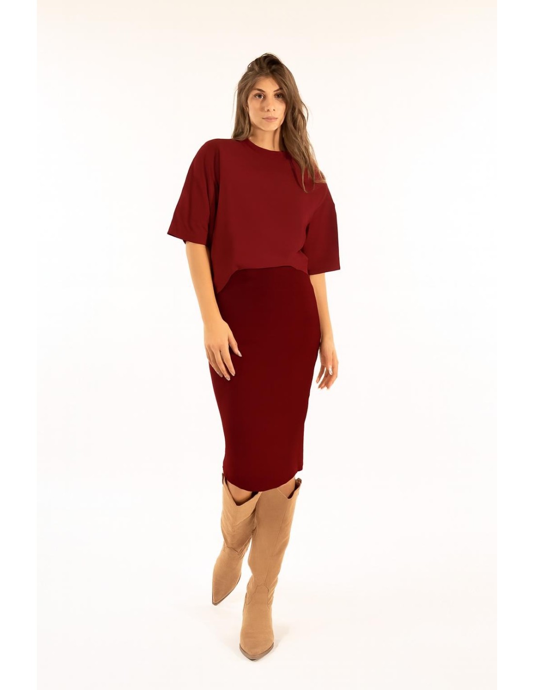 Saia midi em malha Kontatto de corte justo mas confortável graças à estrutura elástica. Textura macia e compacta que envolve a silhueta. Cintura subida com faixa em canelado e pequena abertura na parte de trás para liberdade de movimento. Perfeita do escritório ao aperitivo, com botas ou sapatos de salto.