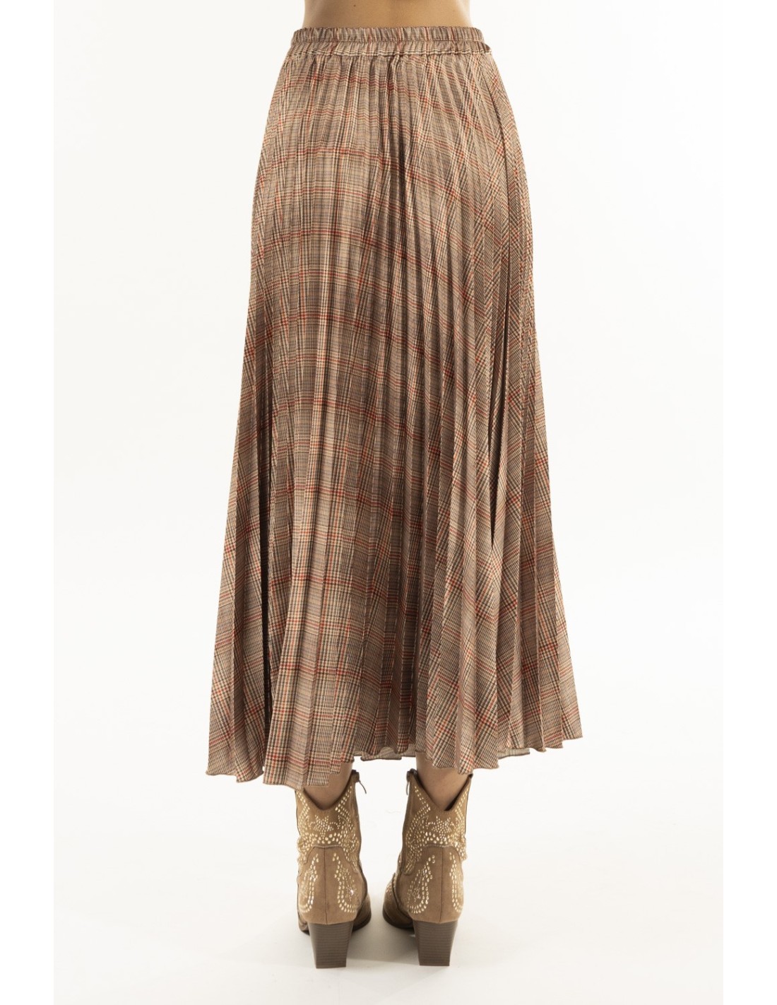 Saia midi plissada, corte fluido que favorece a silhueta. Tecido leve e macio com textura micro-check. Detalhes: cintura elástica para conforto no dia a dia, amplo movimento que acompanha o passo. Perfeita do escritório ao tempo livre, combina com botins ou ténis para um estilo versátil. Marca: Kontatto.