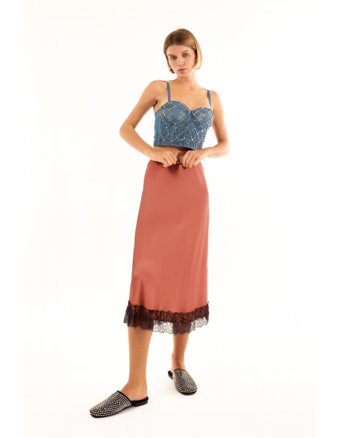 Kontatto assina uma saia midi de corte fluido que valoriza a silhueta sem apertar. Cetim fluido com borda em renda rebrodée, macio ao toque e ligeiramente brilhante. Cintura lisa, barra festonada. Versátil: perfeita com sandálias para festas, com camisola e blazer para o escritório ou para um dia a dia refinado.