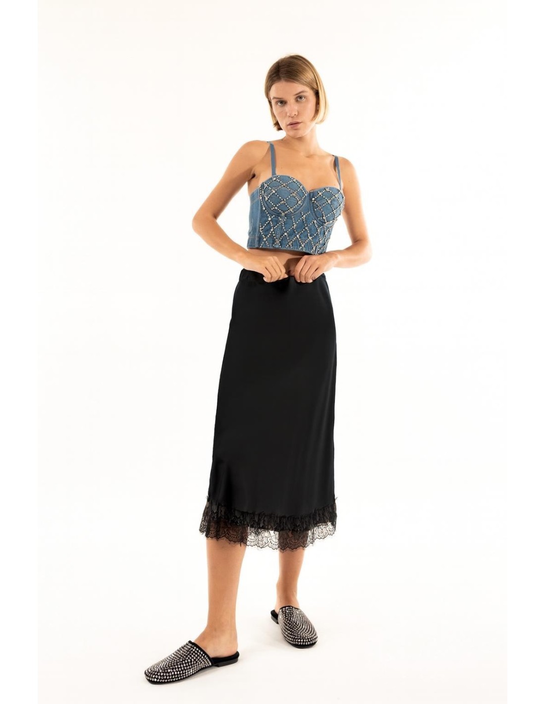 Kontatto assina uma saia midi de corte fluido que valoriza a silhueta sem apertar. Cetim fluido com borda em renda rebrodée, macio ao toque e ligeiramente brilhante. Cintura lisa, barra festonada. Versátil: perfeita com sandálias para festas, com camisola e blazer para o escritório ou para um dia a dia refinado.