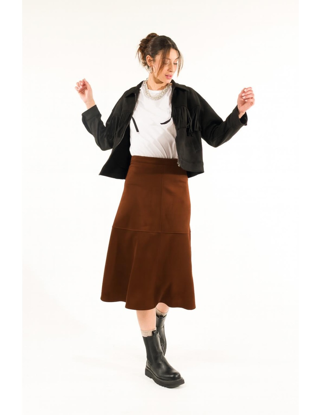 Kontatto assina uma saia midi trapezoidal com um corte macio que valoriza a silhueta sem apertar. Em suave textura efeito camurça, desliza com elegância. Costuras horizontais que alongam e fecho traseiro invisível. Versátil do 9 às 9: impecável no escritório, feminina no tempo livre e para jantares.