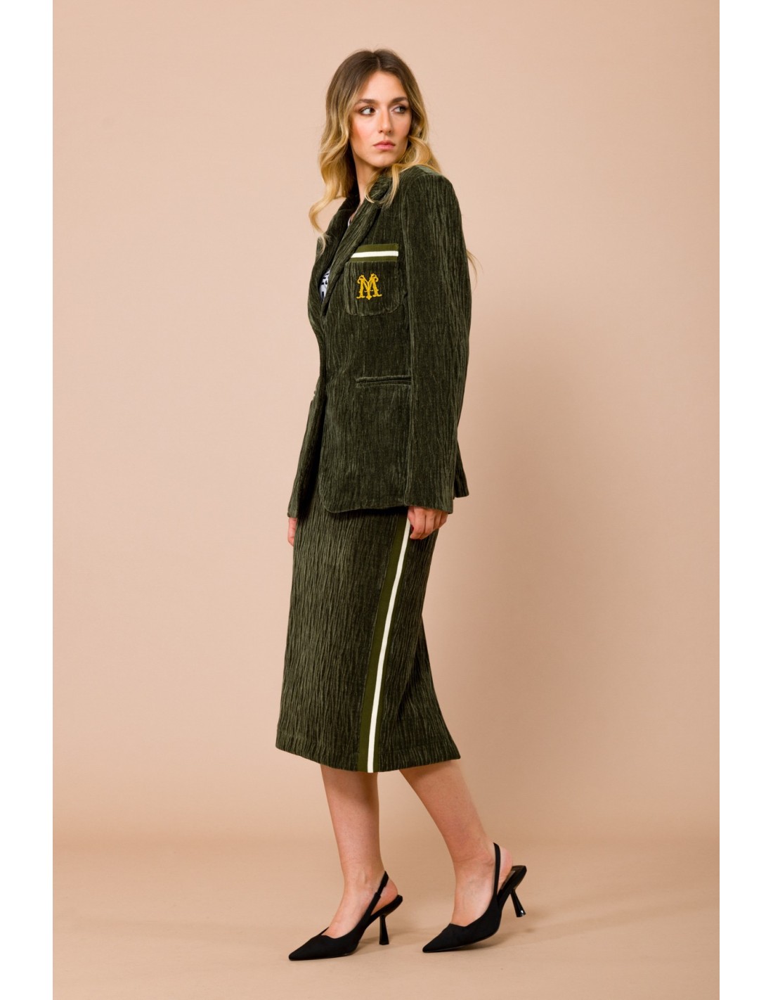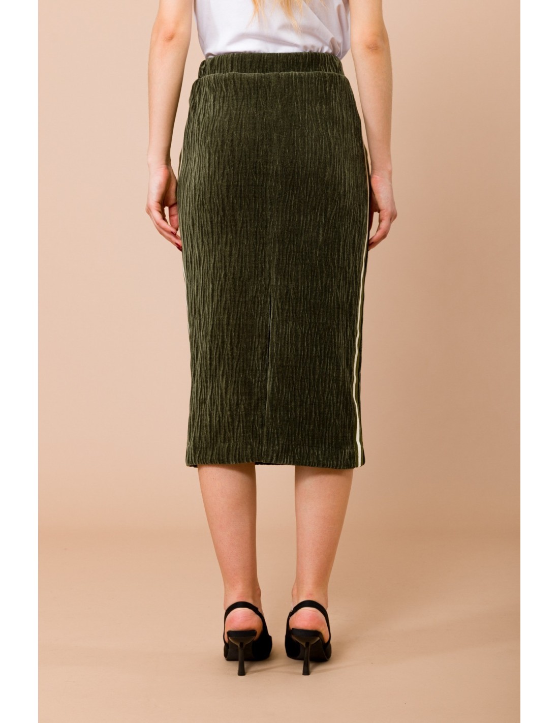 Maryley assina uma saia midi de corte reto e envolvente, em veludo com efeito amassado e bandas laterais em canelado. Cintura elástica com cordão para conforto regulável e fenda traseira que alonga a silhueta. Perfeita do escritório ao aperitivo, combina com blazer ou malha para uma elegância descontraída.