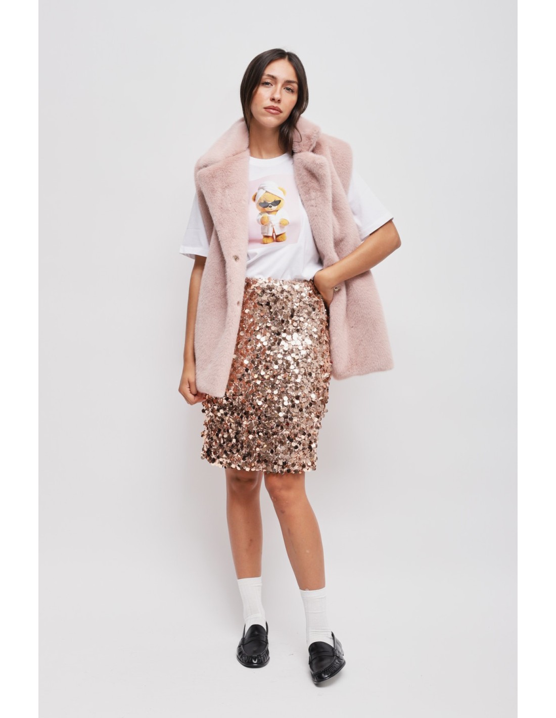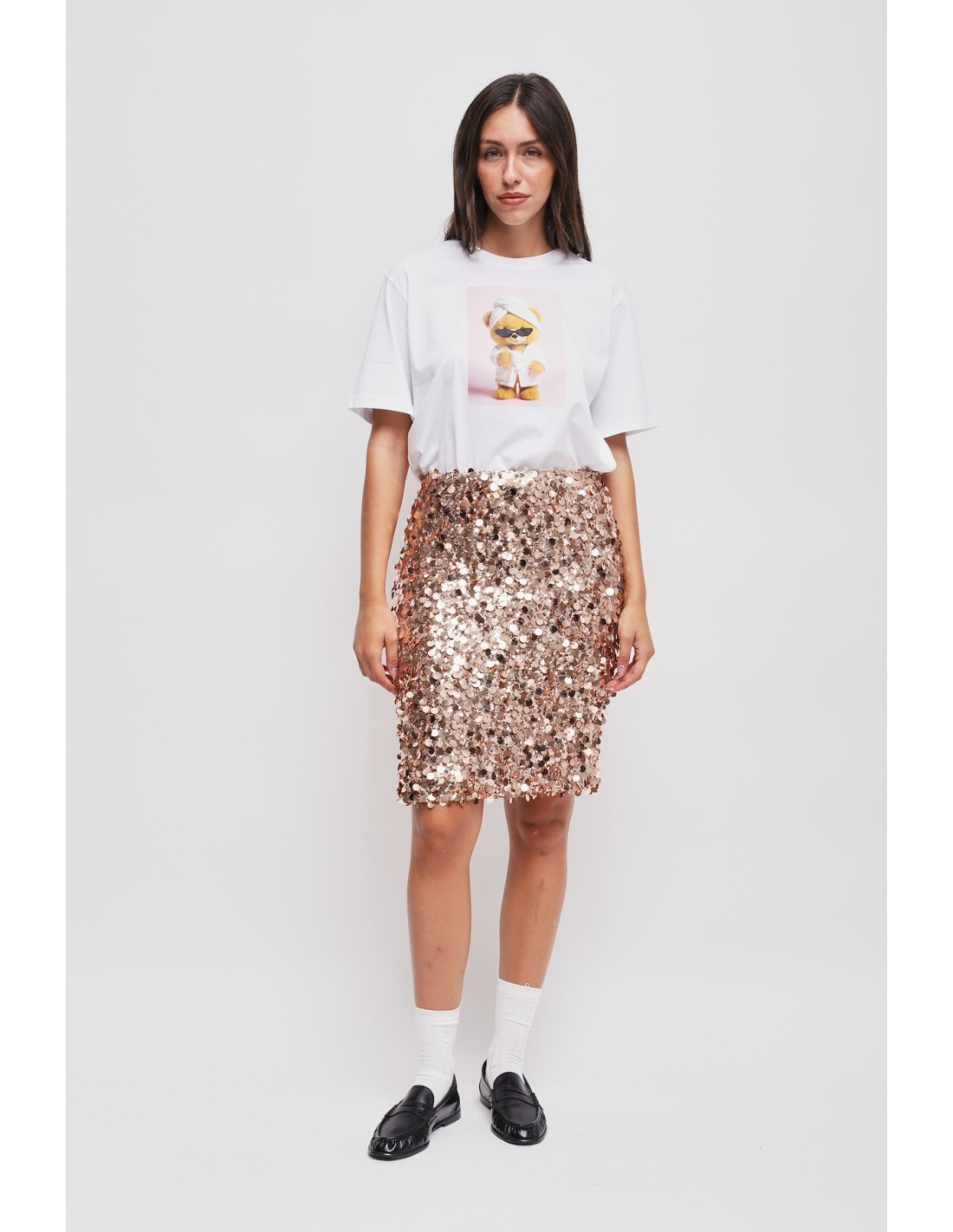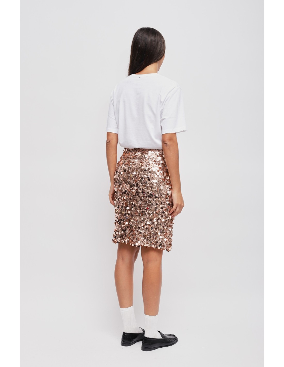 Maryley assina uma saia midi de corte reto que valoriza a silhueta sem apertar. Bordada por toda a superfície com maxi lantejoulas sobre base macia, é forrada para um conforto impecável. Cintura média com fecho de correr invisível e movimento fluido. Perfeita para festas, jantares e looks de noite versáteis.