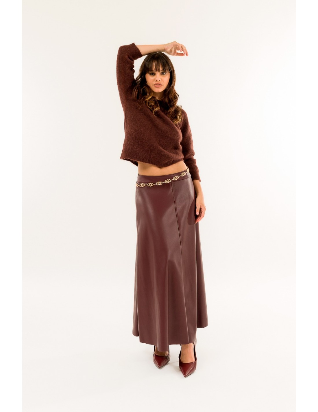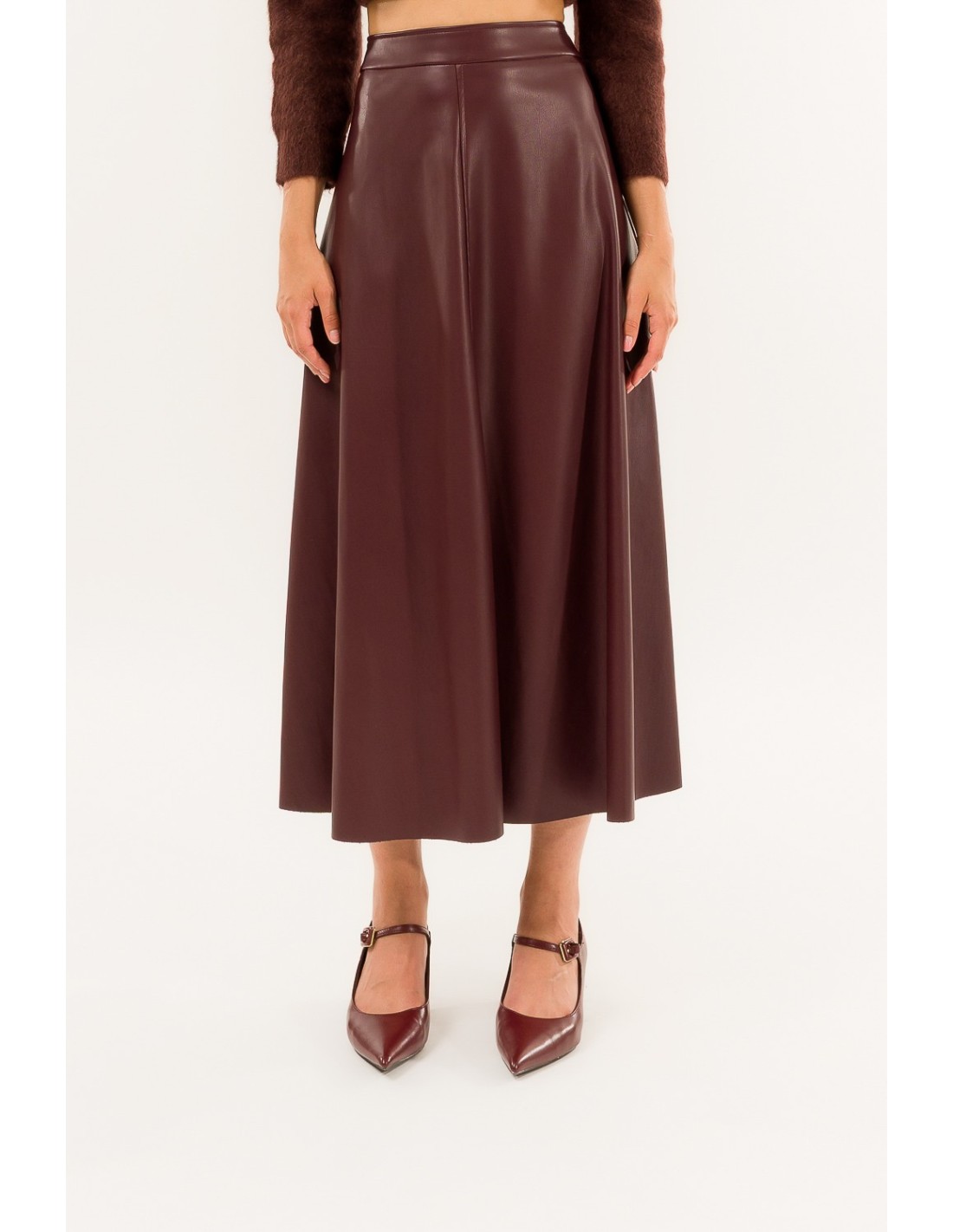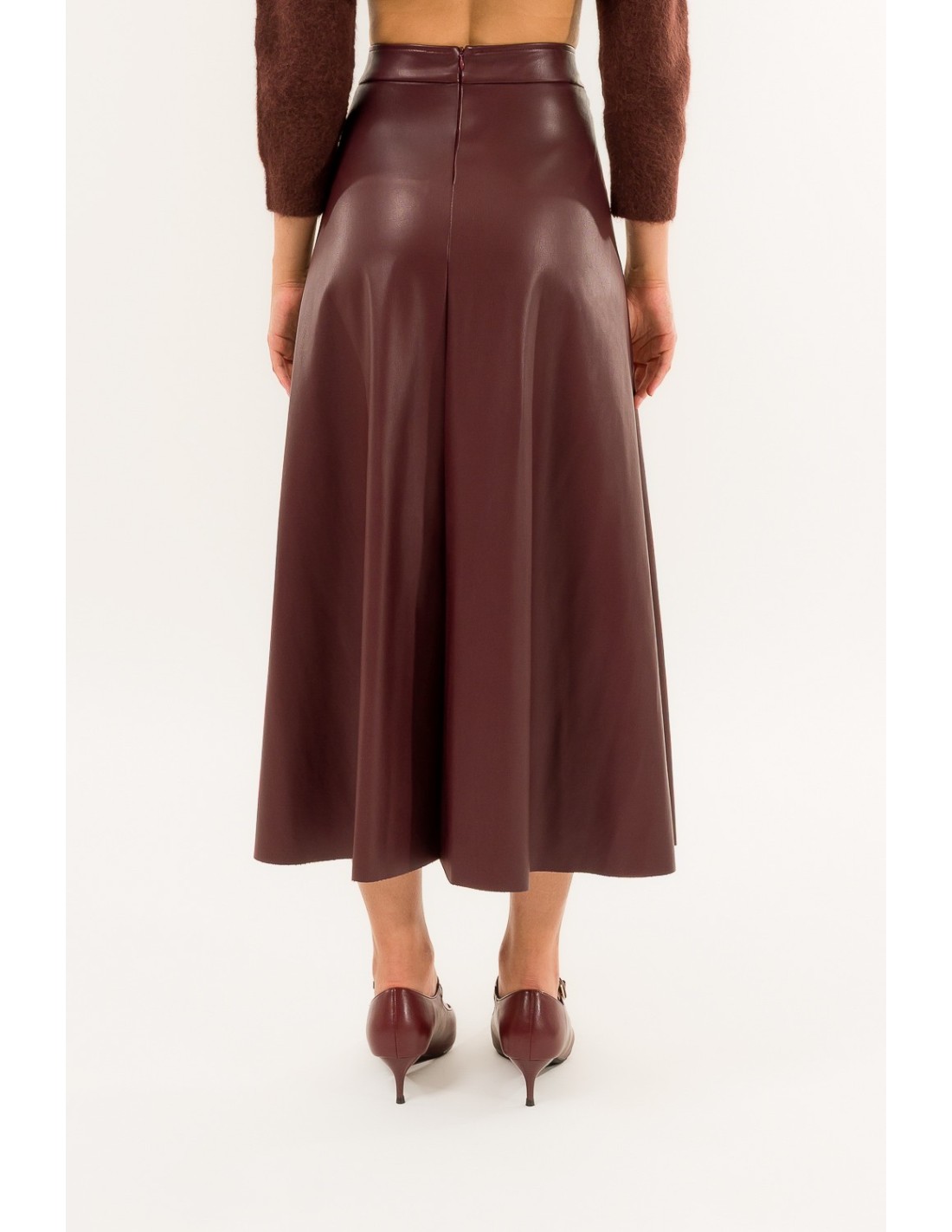 Kontatto assina uma saia midi trapézio: cintura regular e linha que emagrece sem apertar. Confeccionada em pele sintética macia com efeito liso, acompanha o movimento. Detalhes distintivos: costuras verticais que definem a silhueta e fecho invisível nas costas. Perfeita desde o escritório até à hora do aperitivo, com botas ou slingbacks.