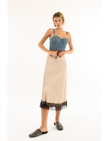 Kontatto assina uma saia midi de corte fluido que valoriza a silhueta sem apertar. Cetim fluido com borda em renda rebrodée, macio ao toque e ligeiramente brilhante. Cintura lisa, barra festonada. Versátil: perfeita com sandálias para festas, com camisola e blazer para o escritório ou para um dia a dia refinado.
