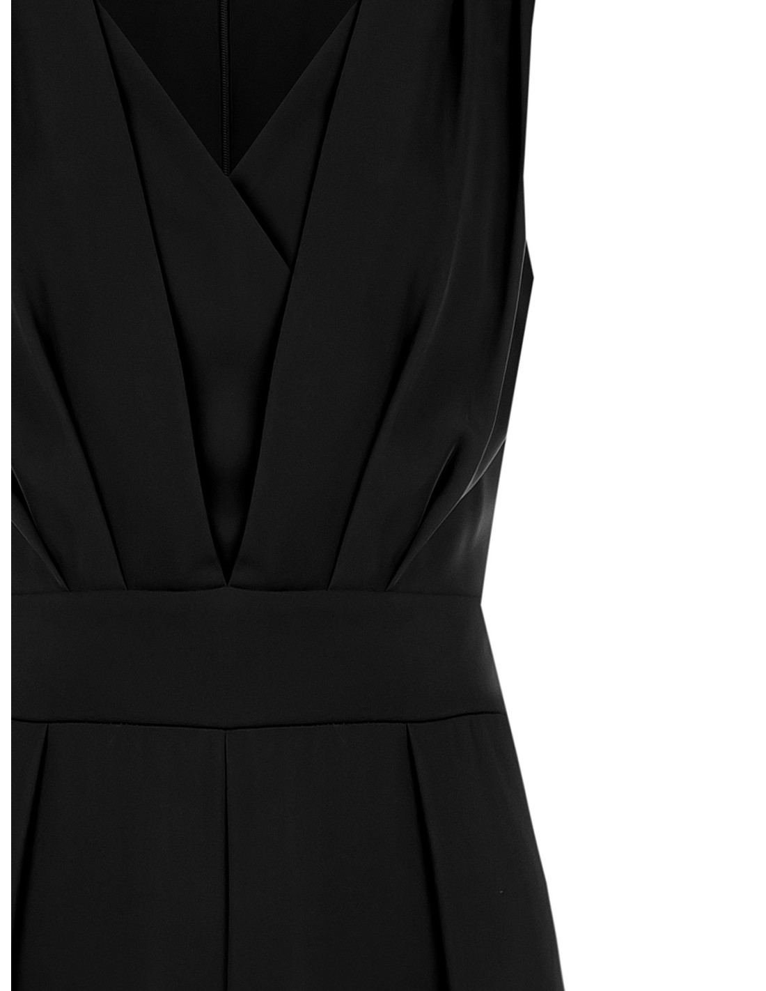 Macacão elegante com perna larga, ajuste suave que emagrece a silhueta. Confeccionado em tecido fluido e leve, cai com movimento natural. Corpete cruzado com decote em V e drapeado, laço nas costas que define a cintura. Perfeito para cerimónias, festas e noites, mas também versátil para o escritório com um blazer.