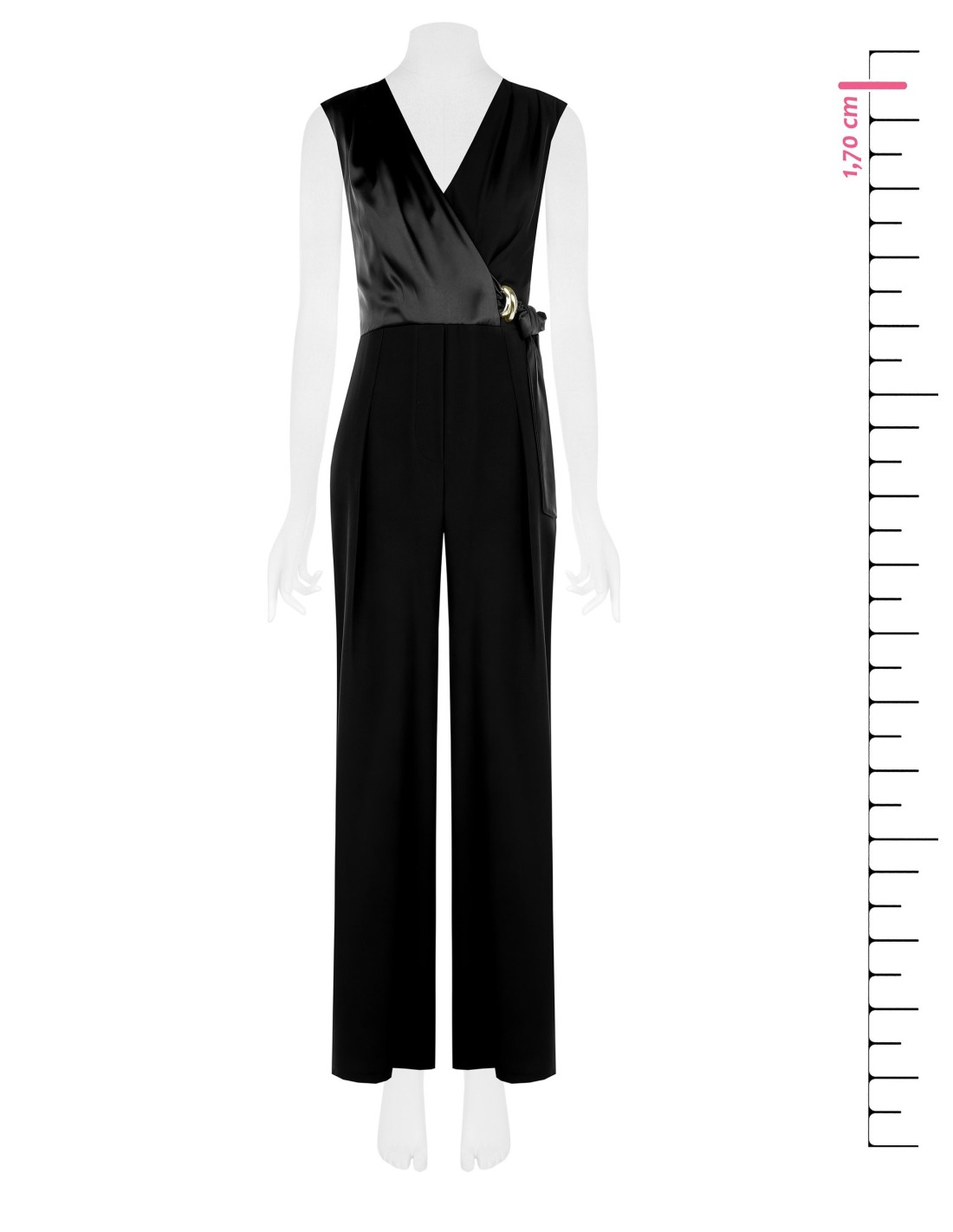 Macacão inteiro em tecido fluido com blusa em cetim e detalhe de joia
