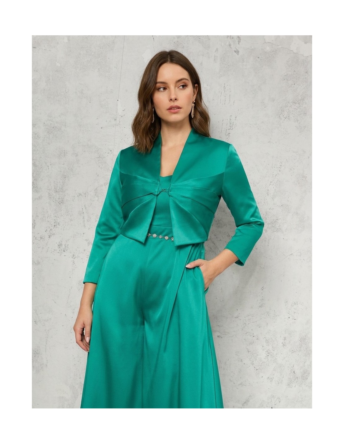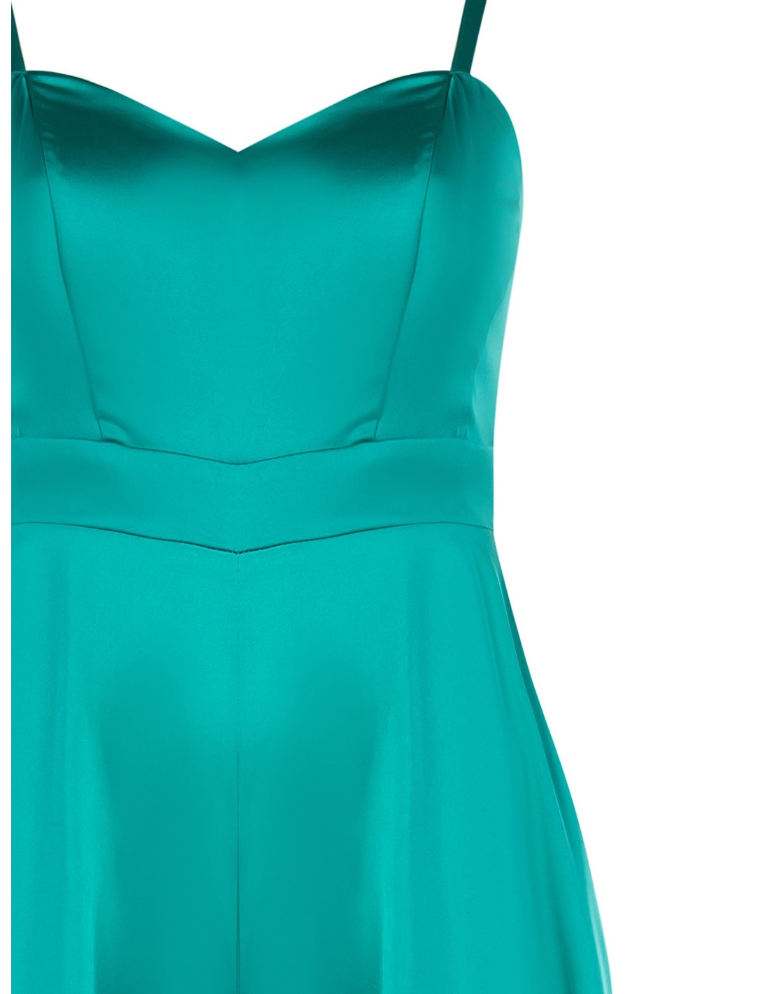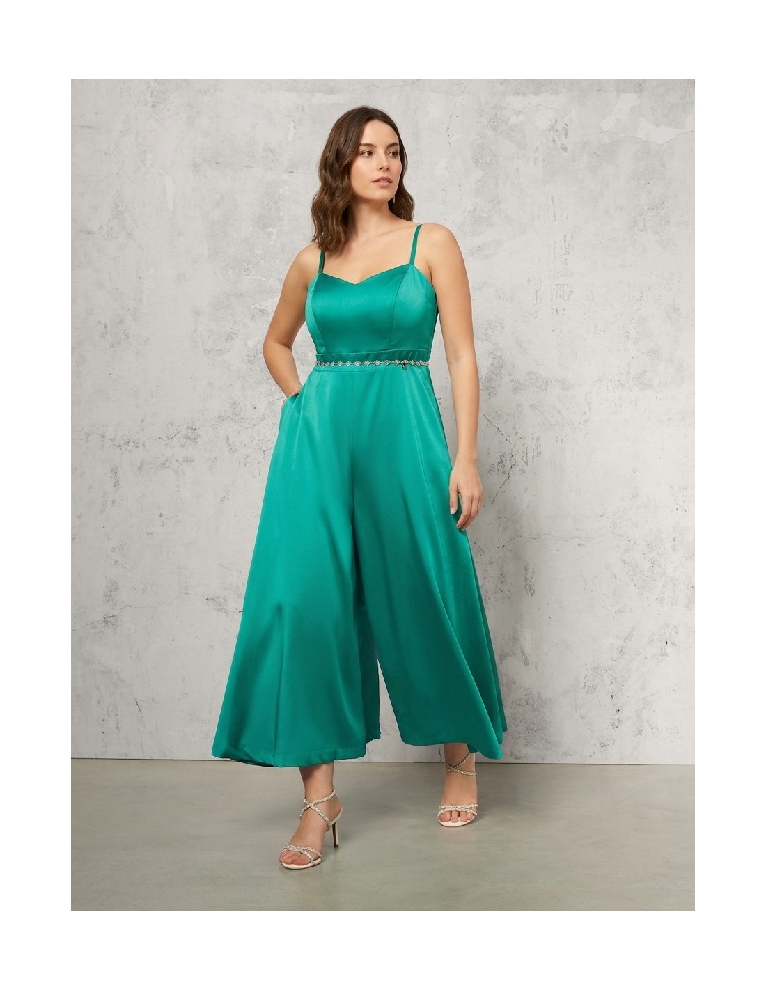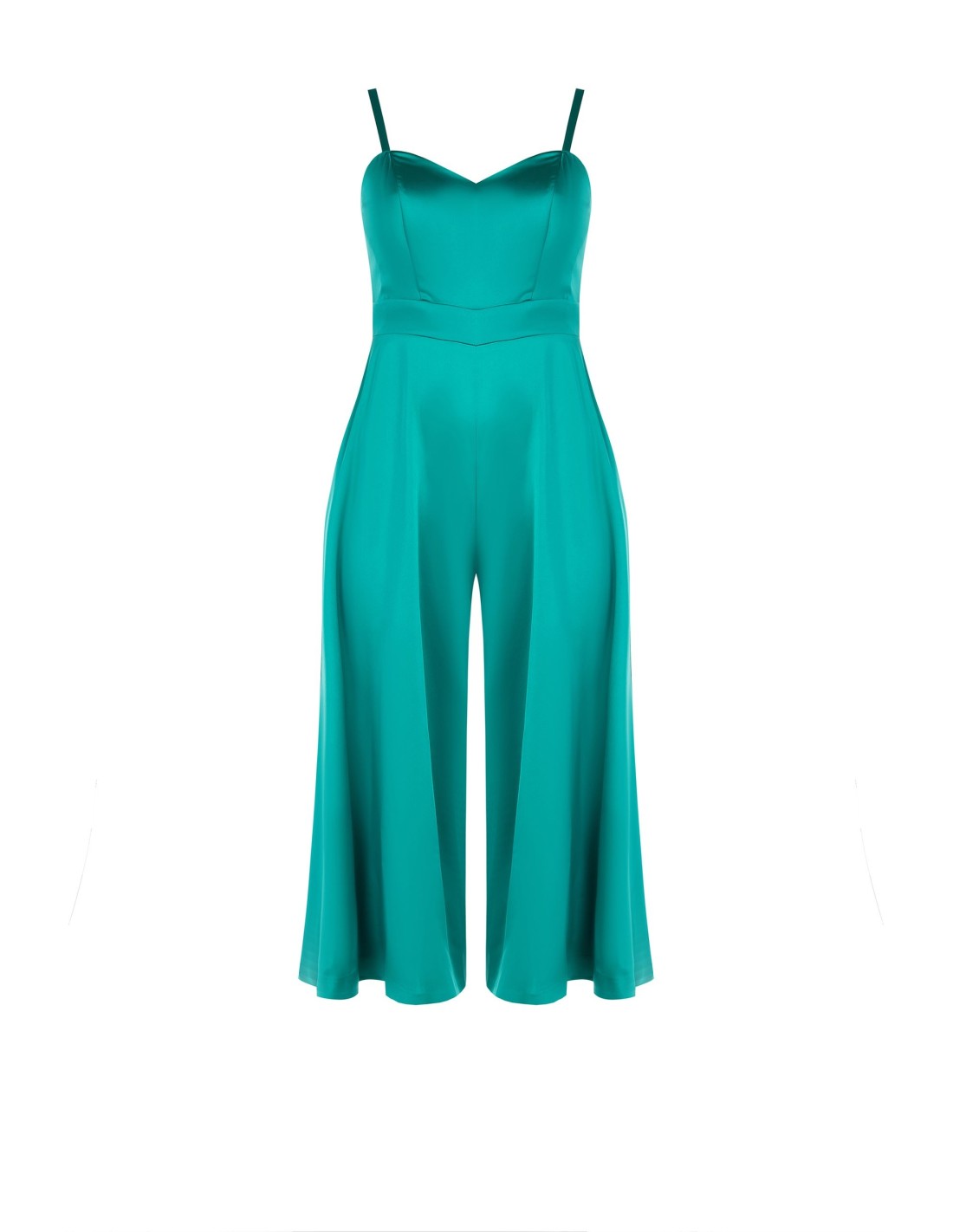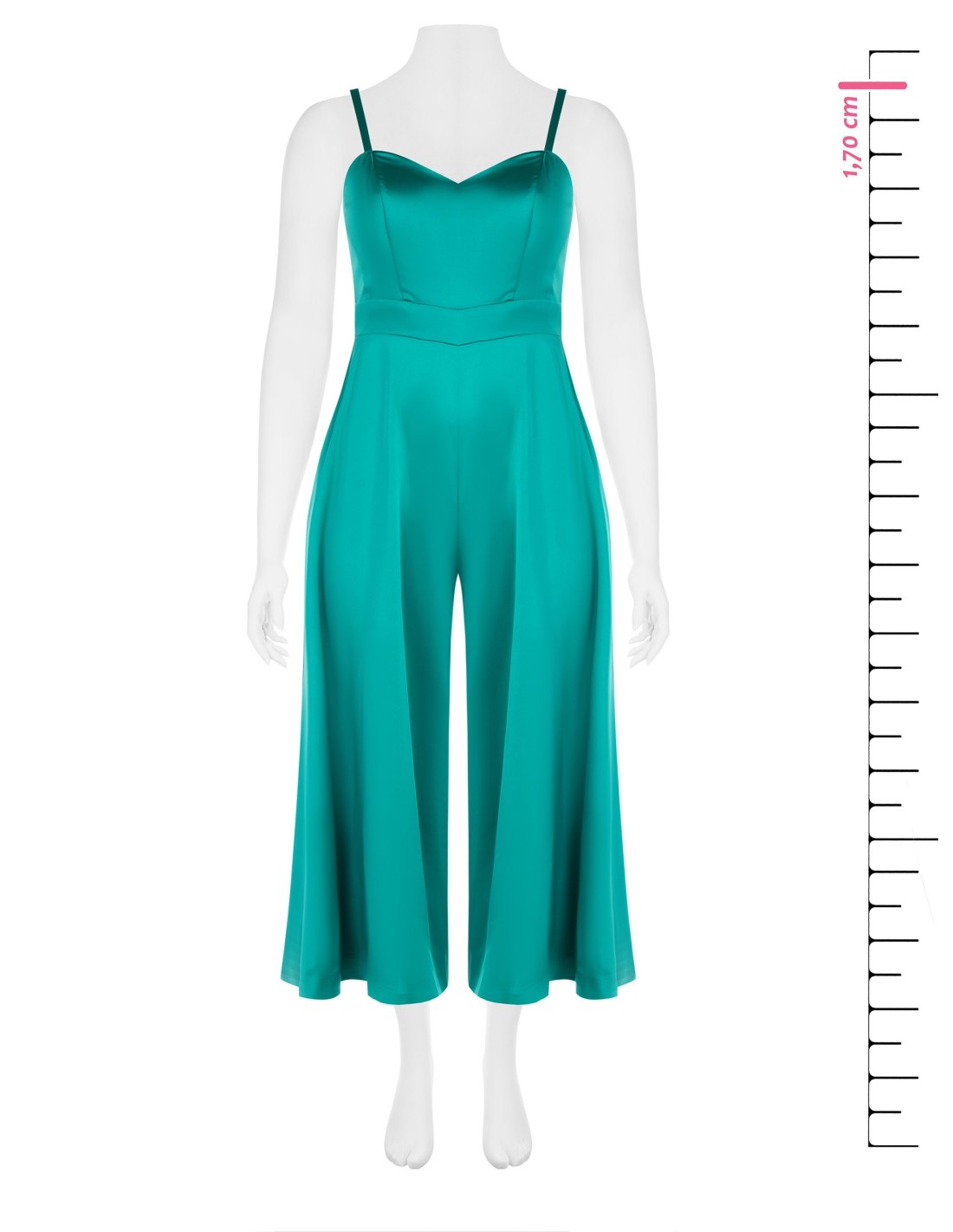 Linha fluida e fit que valoriza a cintura, com perna ampla que afina e acompanha os movimentos. O tecido acetinado, com toque estruturado, oferece conforto e queda elegante. Decote coração e alças finas completam o look, perfeito para cerimónias, festas ou noites especiais.