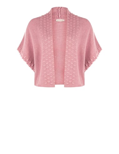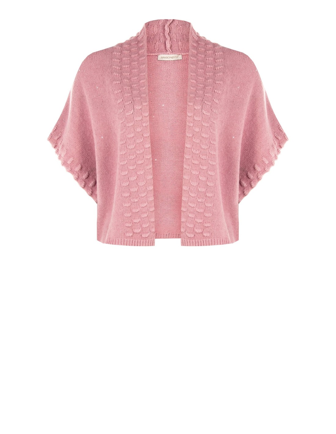 Rinascimento Curvy assina uma peça curta e aberta, corte solto e fluido que valoriza a silhueta. Malha macia com micro lantejoulas dispersas e bordos trabalhados em relevo. Ombros caídos e manga kimono para liberdade de movimento. Perfeito com vestidos ou denim: do escritório ao aperitivo, adiciona luz com leveza.