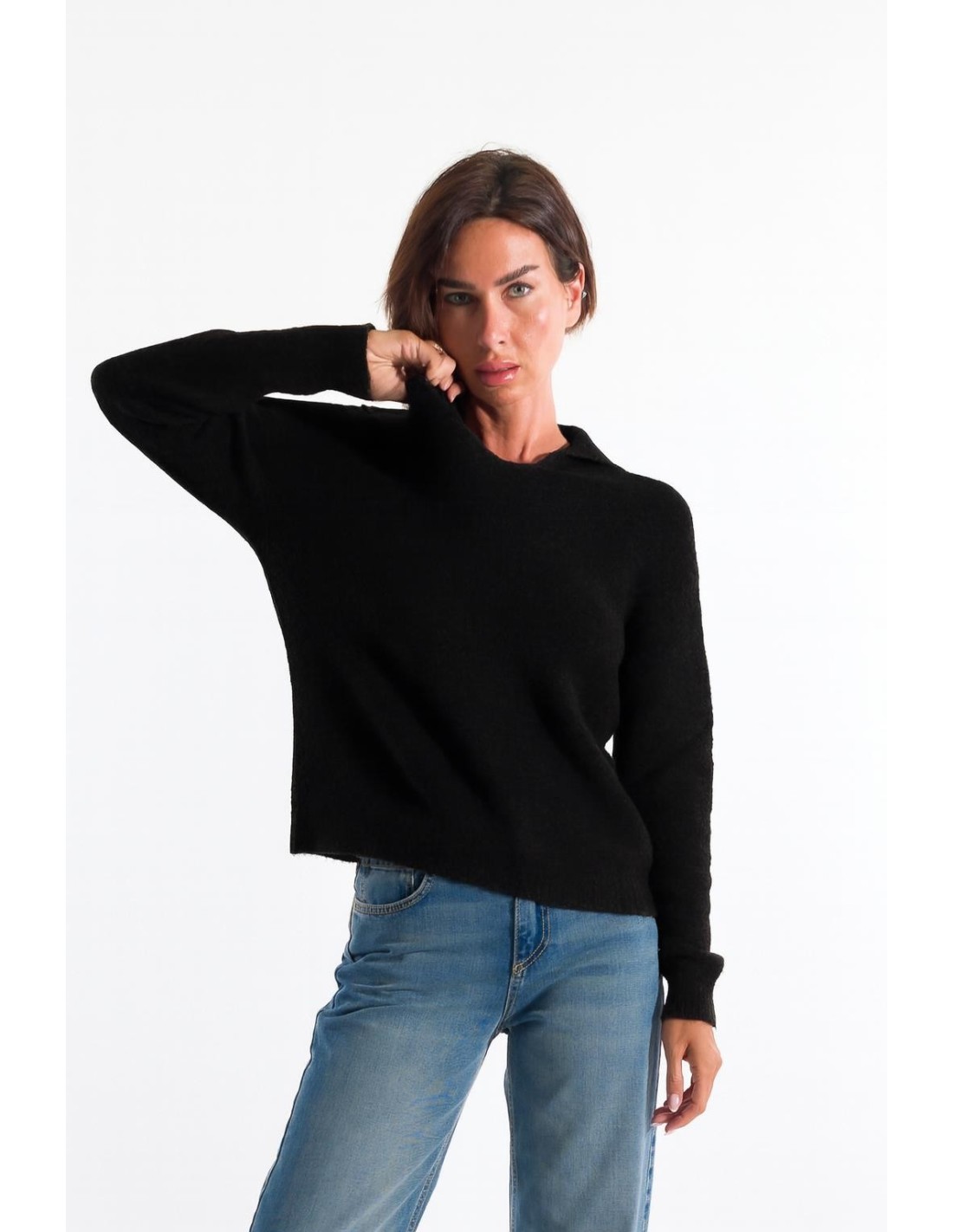 Kontatto assina um pulôver com um corte macio e ligeiramente boxy, que valoriza a silhueta sem a apertar. Fio macio com efeito escovado para conforto quente durante todo o dia. Decote em V, gola tipo tira e ombro caído para um toque descontraído. Ideal para o dia a dia e para escritório smart com denim ou fato.