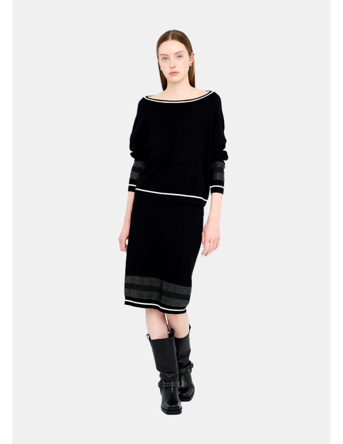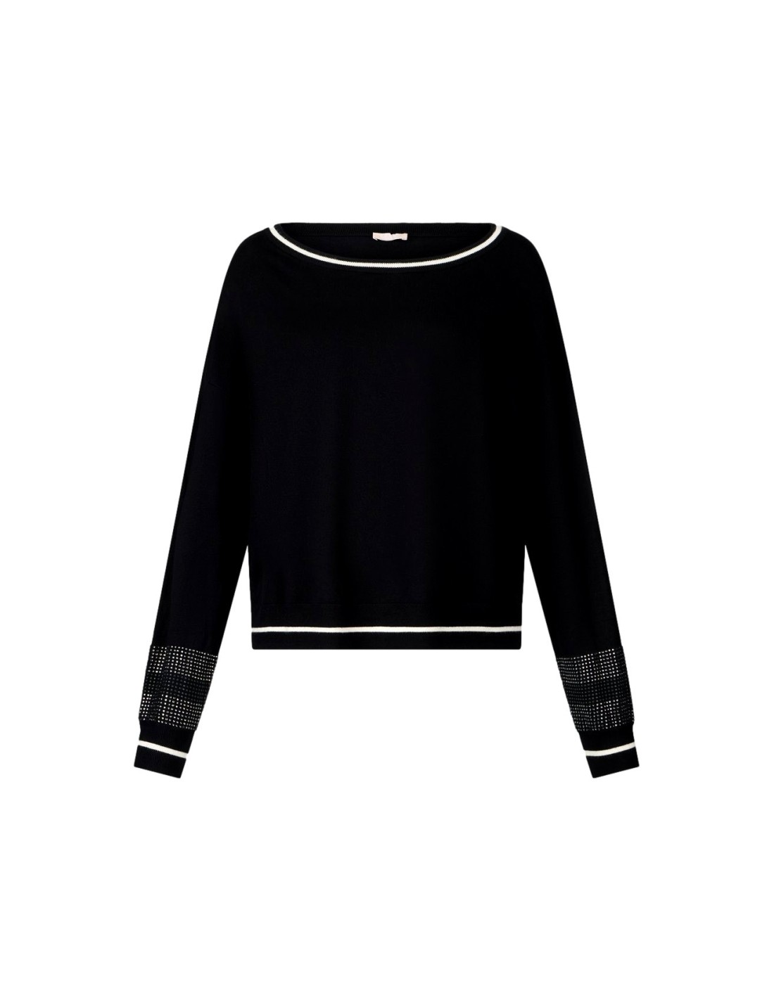 Jersey de mistura de viscose, strass e mini tachas aplicadas, decote em barco, mangas compridas, bordas com nervuras com padrão listrado, eco-friendly.