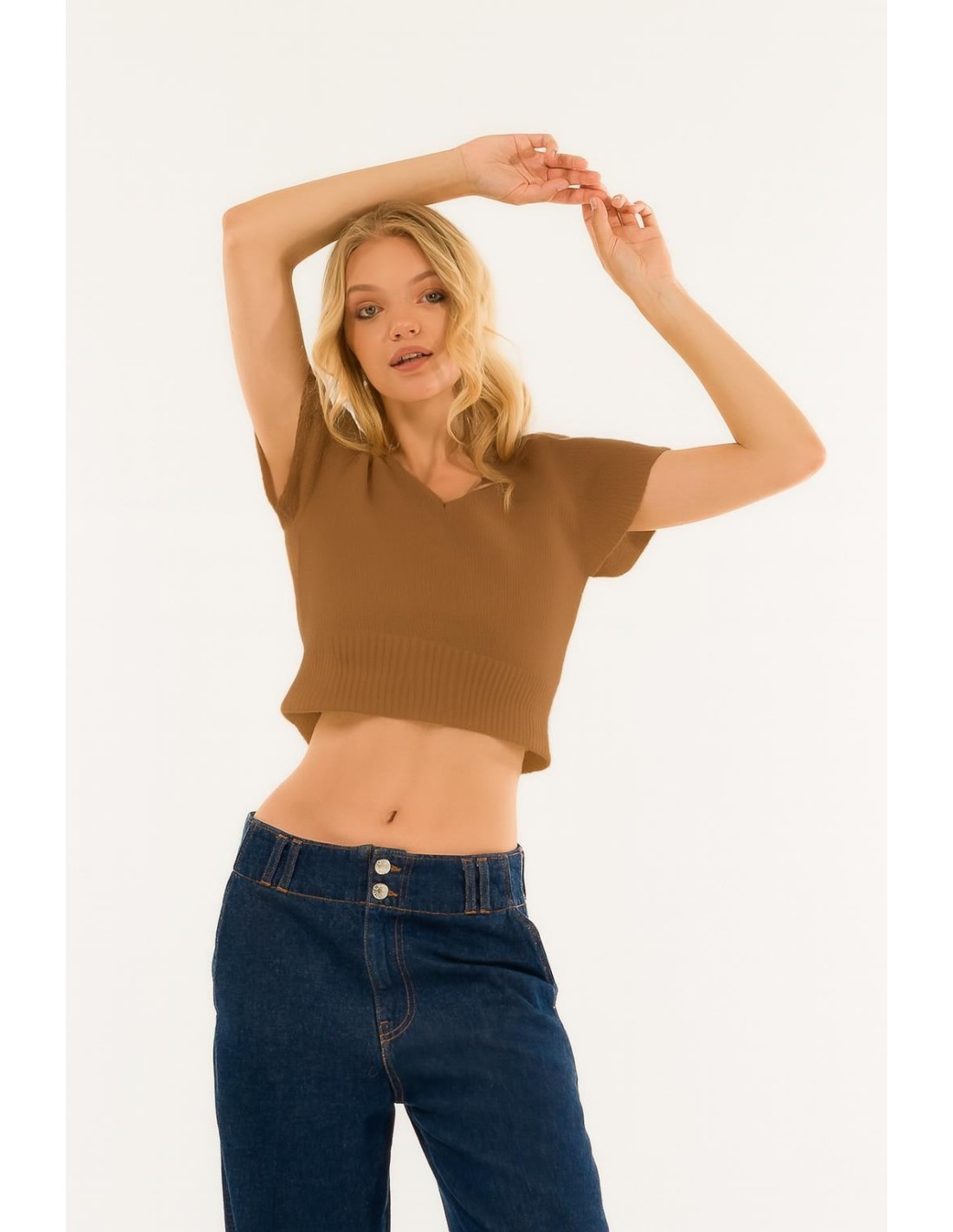 Um toque delicado de charme contemporâneo: esta camisola cropped valoriza a silhueta com elegância e leveza. O seu decote em V e a suavidade do tecido tornam-na perfeita para criar conjuntos requintados, femininos e irresistivelmente contemporâneos.