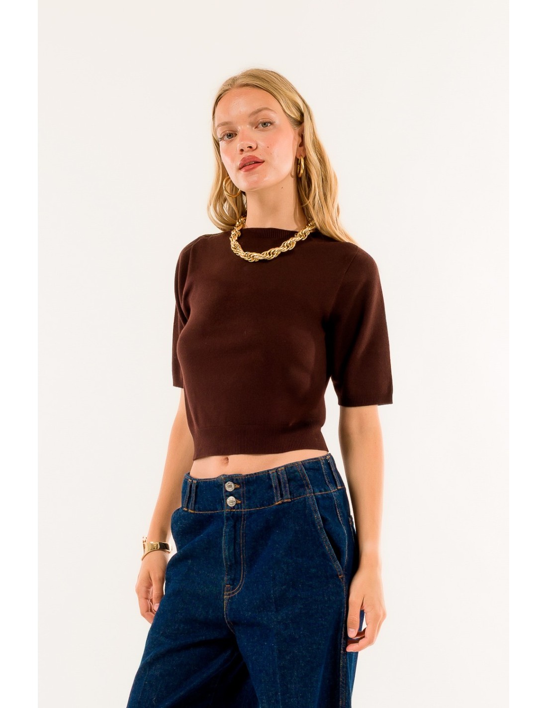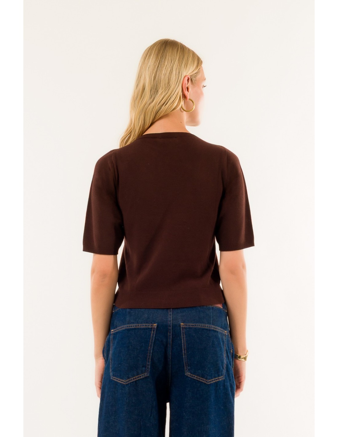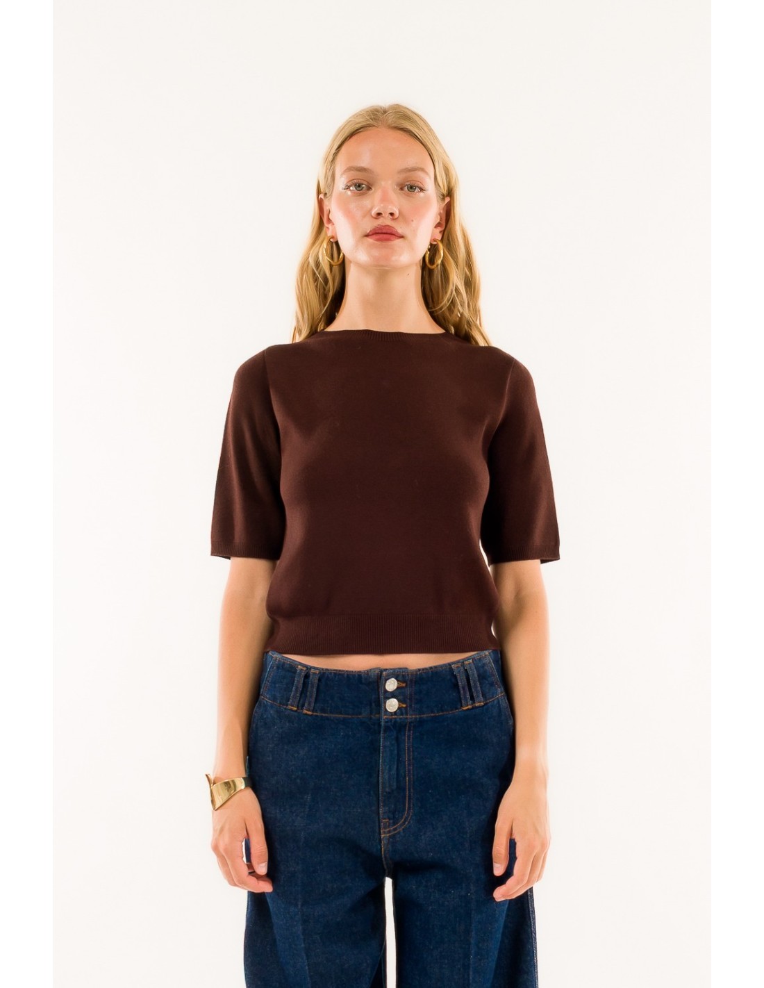 Top em malha de manga curta da Kontatto, macio e ligeiramente curto que valoriza a silhueta sem apertar. Malha fina e compacta, agradável para a pele. Pormenores: decote efeito barco, acabamento canelado na bainha inferior e nas mangas. Ideal para o escritório com um blazer ou para usar no dia a dia com calças de ganga.