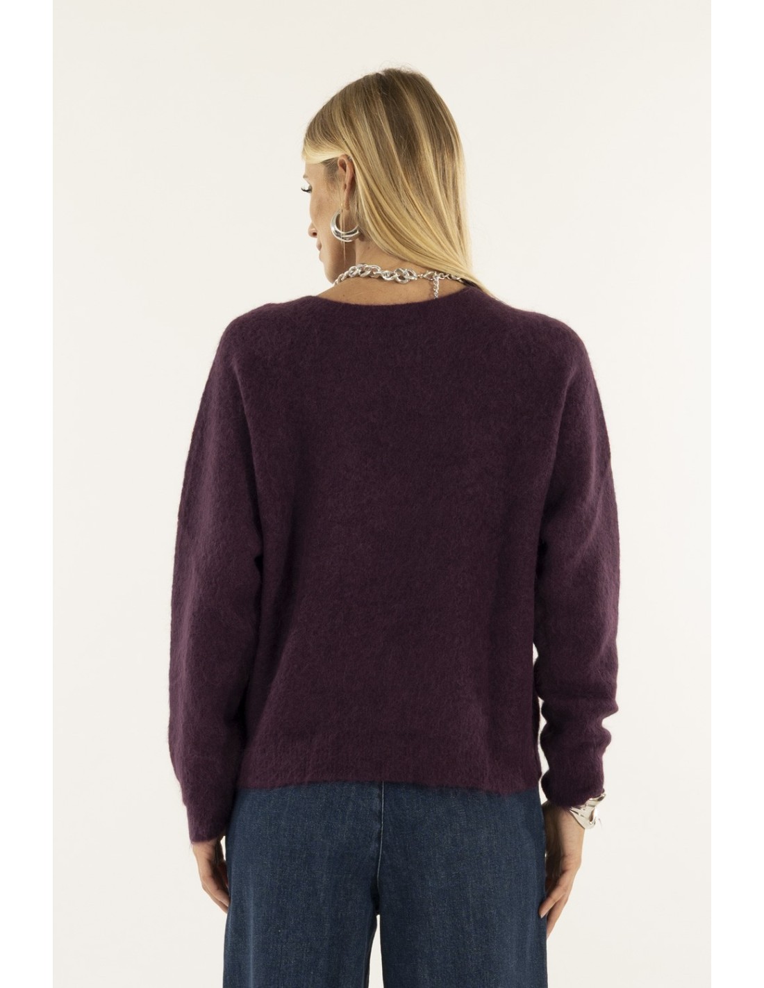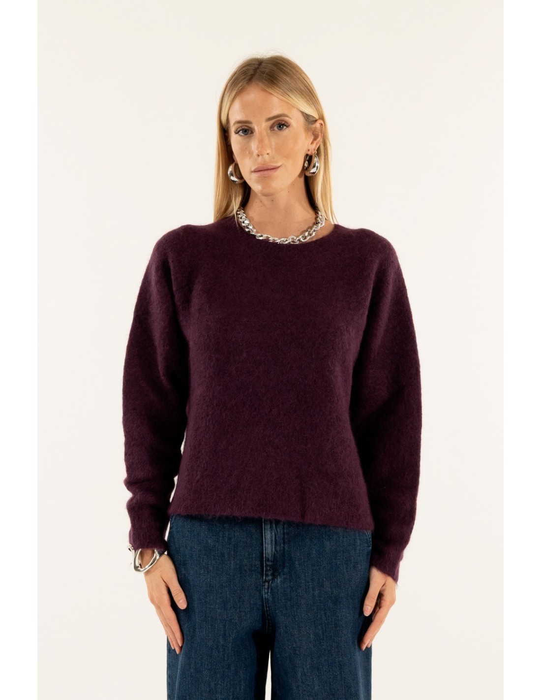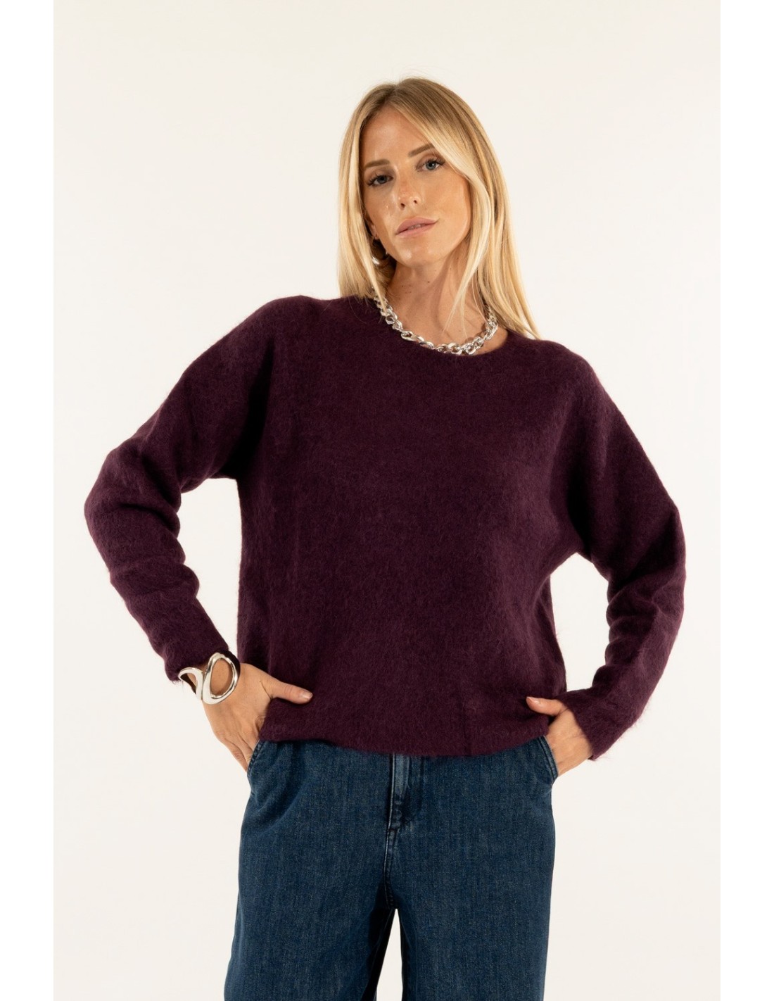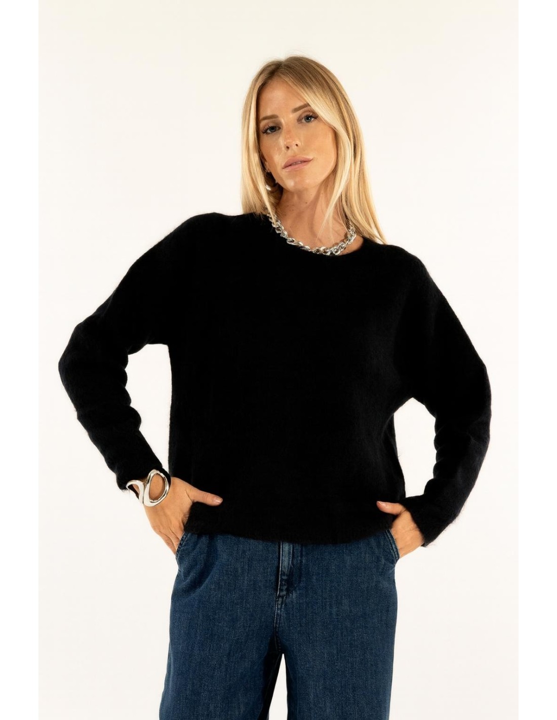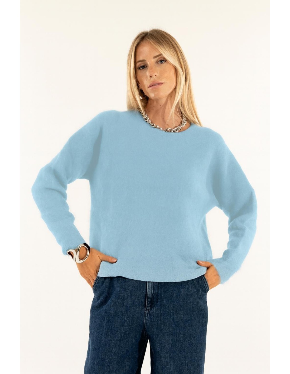 Jersey Kontatto com um corte suave e ligeiramente descontraído, envolvente graças à mão macia num fio de mistura de lã peluda. Linha limpa com decote redondo e mangas com construção que suaviza os ombros para uma silhueta natural. Borda discreta em bruto. Perfeito para o escritório e para o dia a dia com ganga ou alfaiataria.