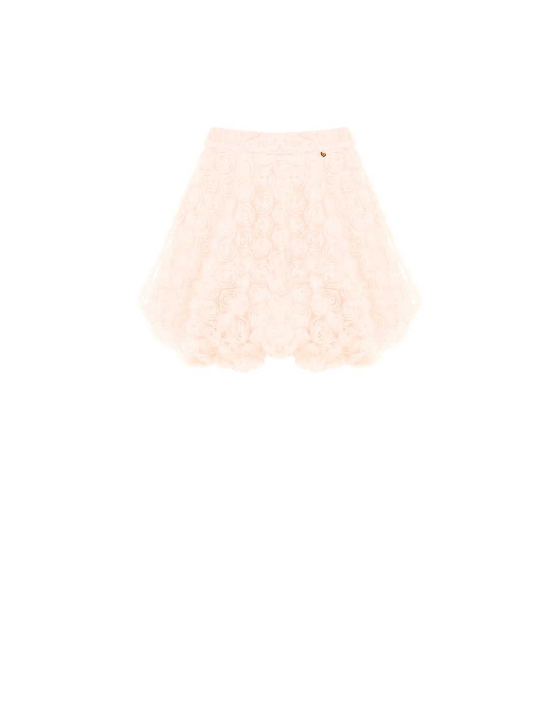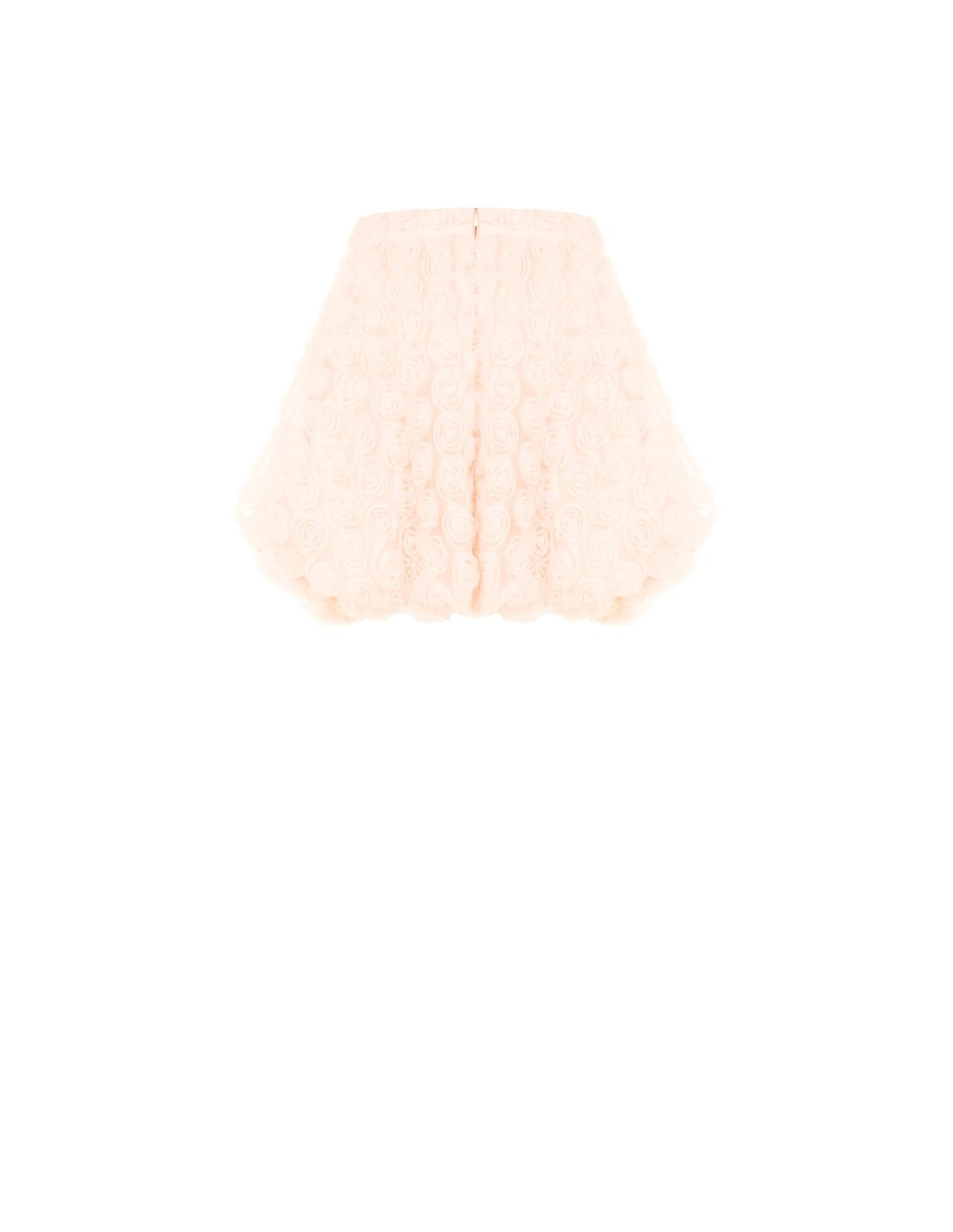 Saia curta de volume suave e corte estruturado que valoriza a silhueta com leveza. O tule trabalhado em rosas tridimensionais e a bainha arredondada conferem movimento, enquanto o fecho de correr nas costas garante conforto. Perfeita para festas, cerimónias e eventos especiais.
