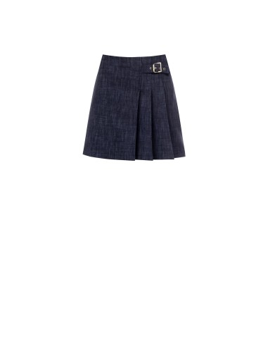 Minissaia Rinascimento com um corte trapezoidal que emagrece a silhueta. Confeccionada em ponto Milano stretch, compacta e confortável, com textura melange. O plissado frontal profundo e o cinto com fivela metálica lateral realçam a cintura. Perfeito do escritório ao cocktail, mesmo com botas ou slingbacks.