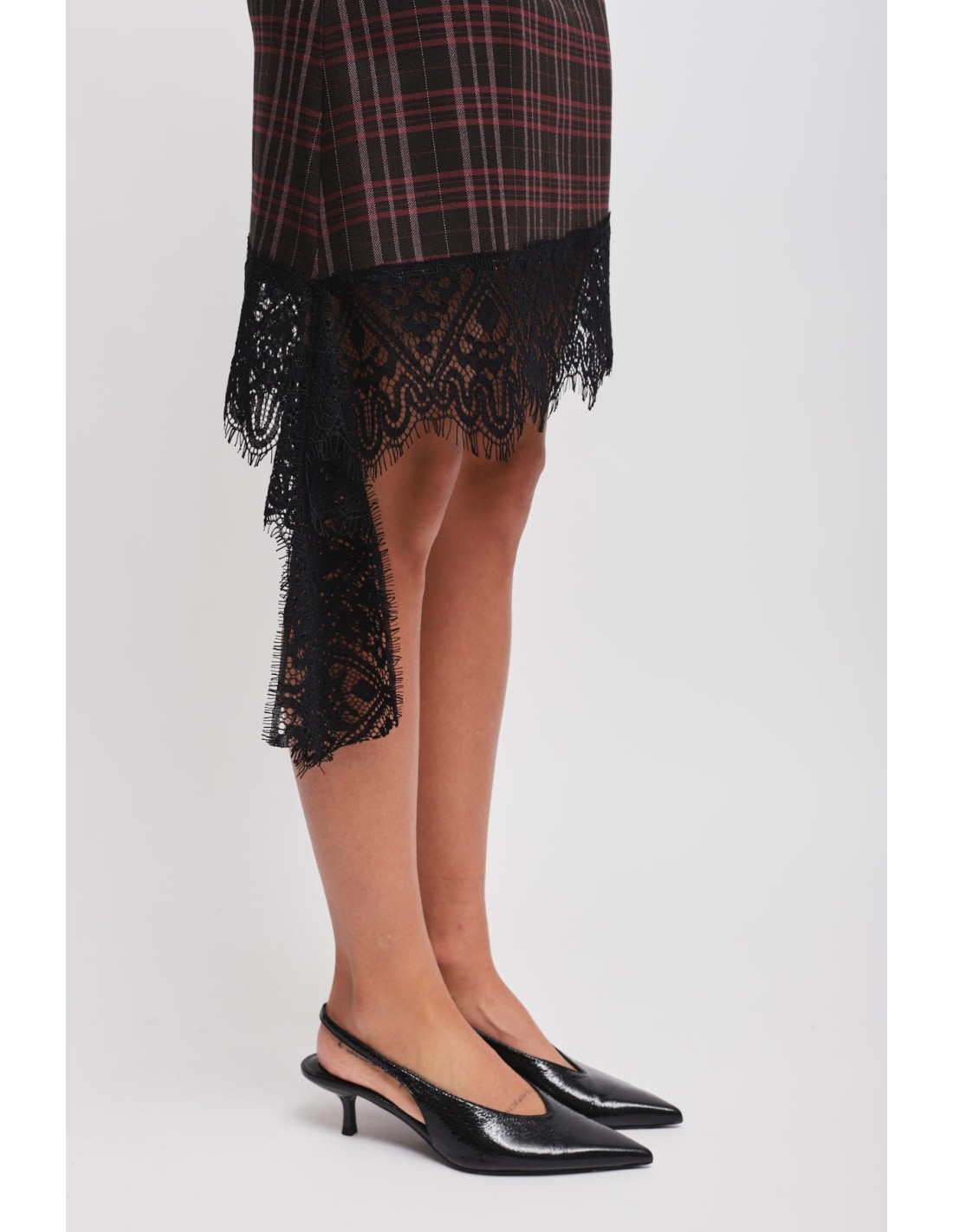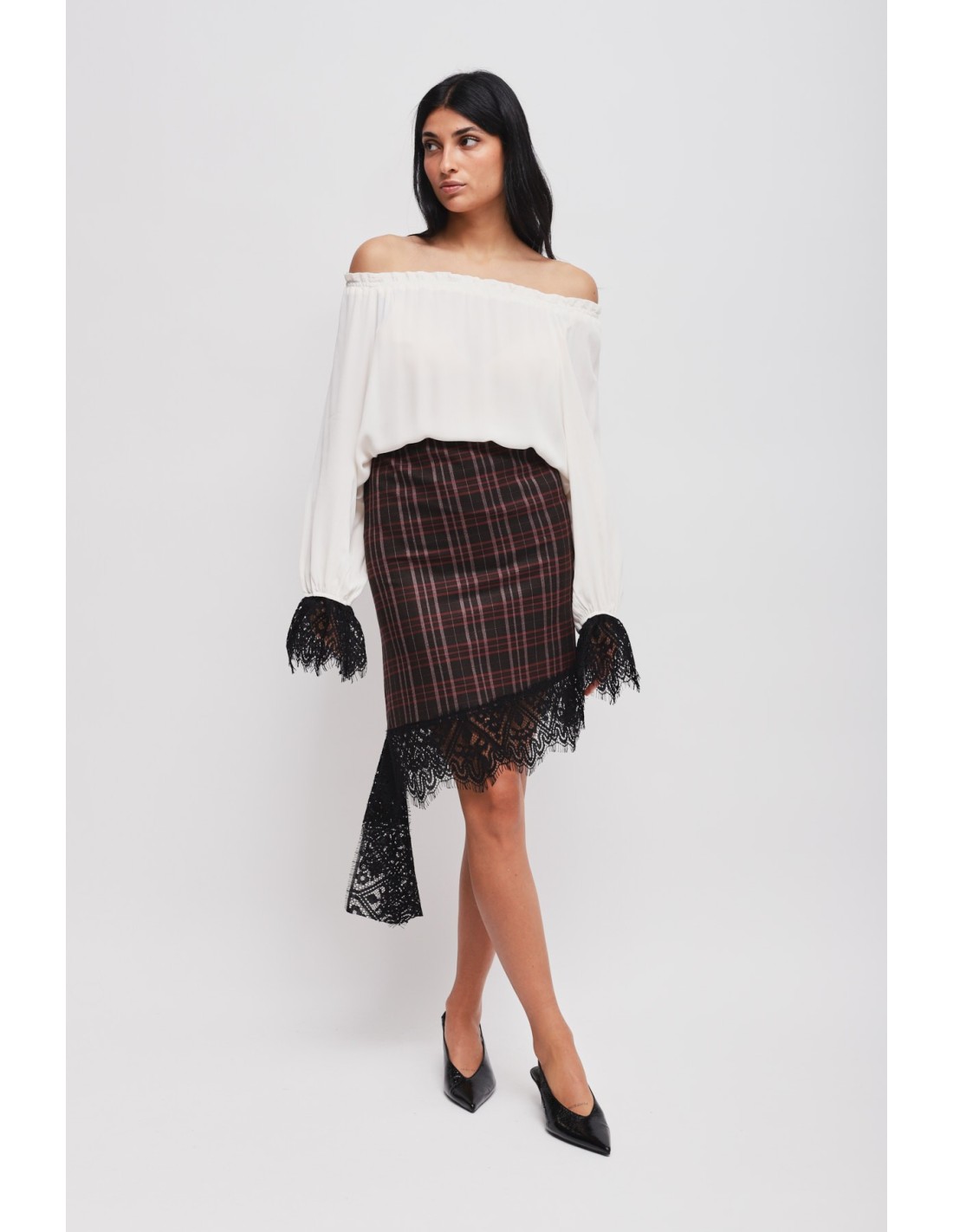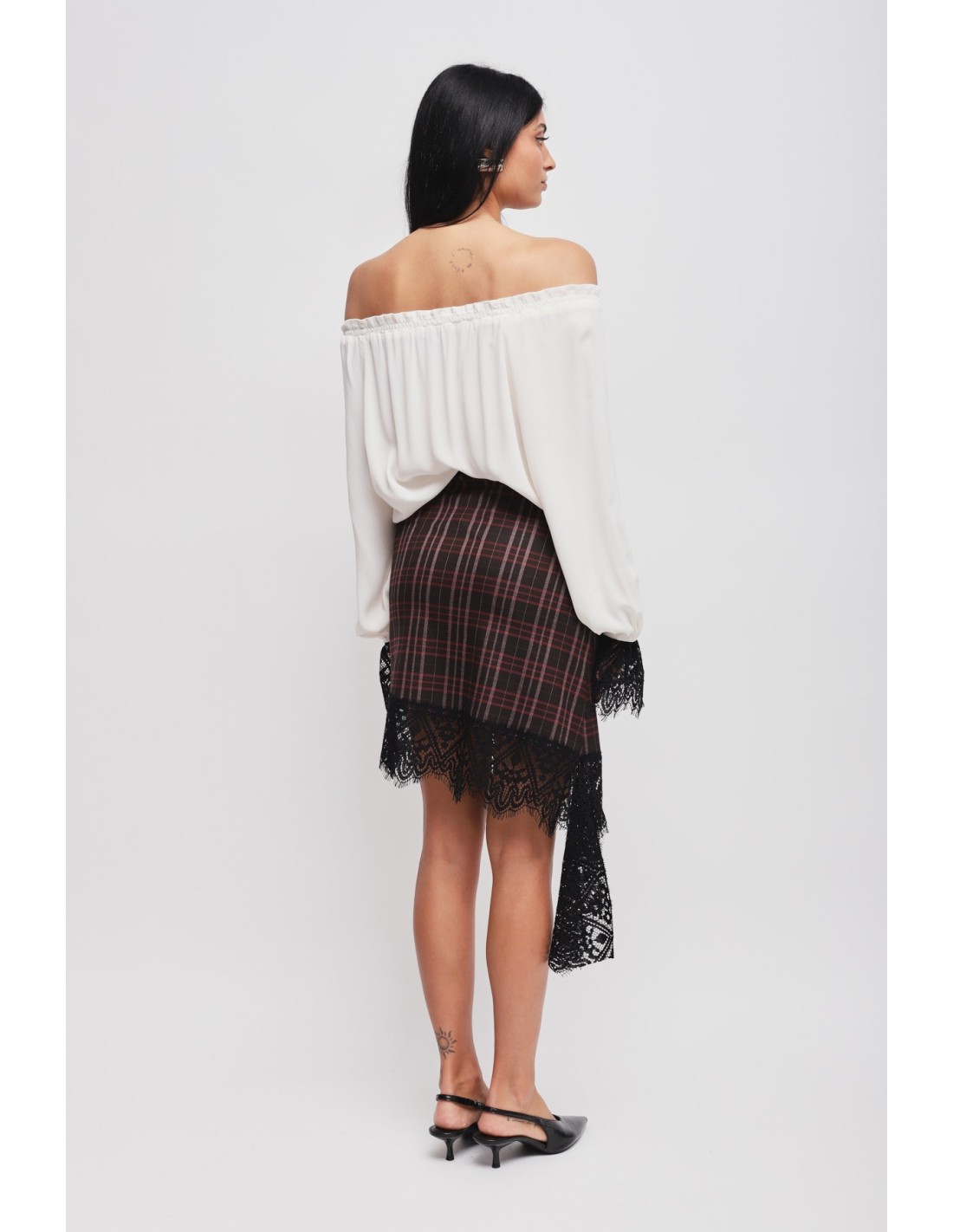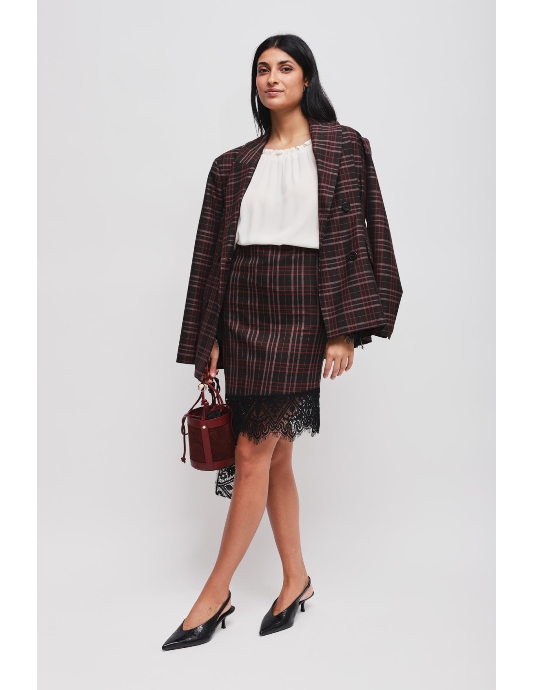 Maryley assina uma saia curta com corte direito que modela a silhueta com conforto. Tecido xadrez com toque compacto, acabado com renda gráfica numa bainha assimétrica. Fecho invisível nas costas para uma linha limpa. Perfeita do escritório ao aperitivo: combina-a com um blazer ou uma malha macia para uma elegância descontraída.