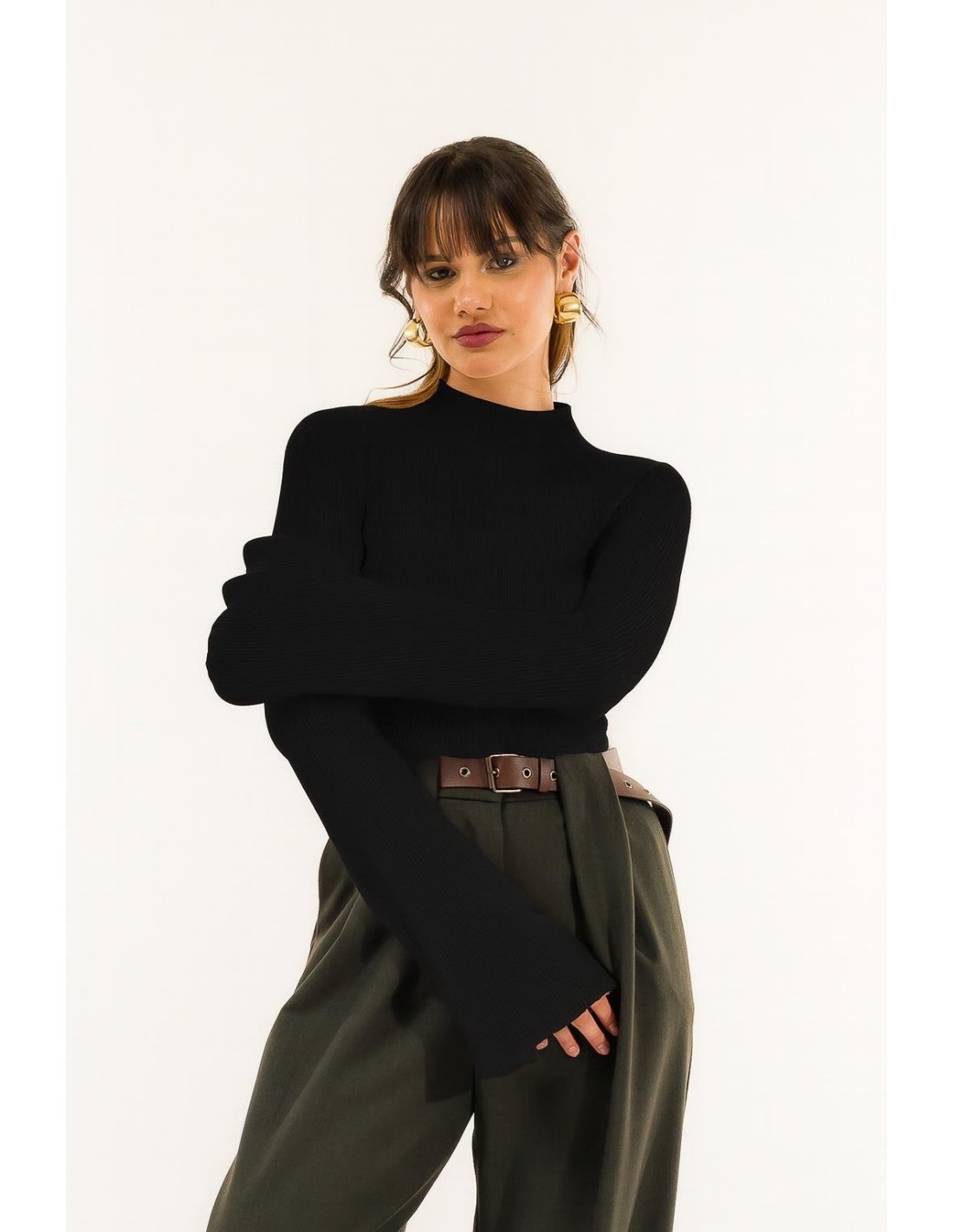 Linhas limpas, mangas largas com um apelo irresistível e uma silhueta que acaricia suavemente: esta camisola acrescenta um toque refinado a cada conjunto, realçando a feminilidade e o estilo com uma elegância intemporal.