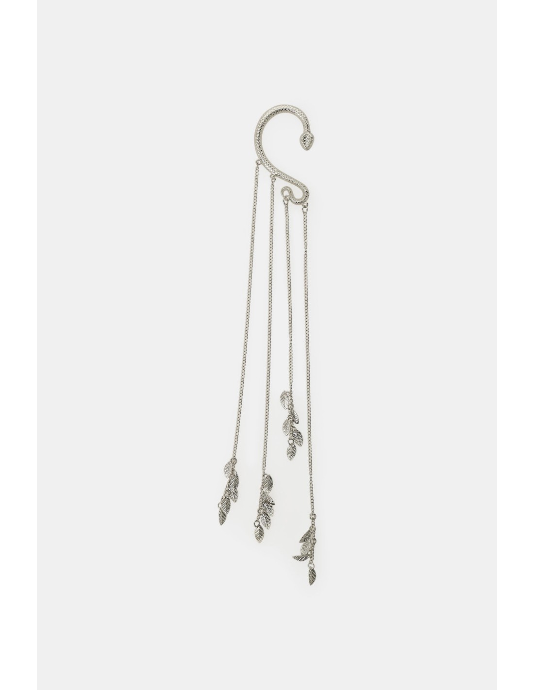 Este brinco ear cuff apoia-se elegantemente na orelha com uma sinuosa forma de serpente decorada por uma série de correntes finas. Cada corrente termina com pendentes em forma de folha trabalhados, para um efeito requintado e dinâmico que acompanha os teus movimentos e valoriza qualquer look do dia a dia com um toque original.