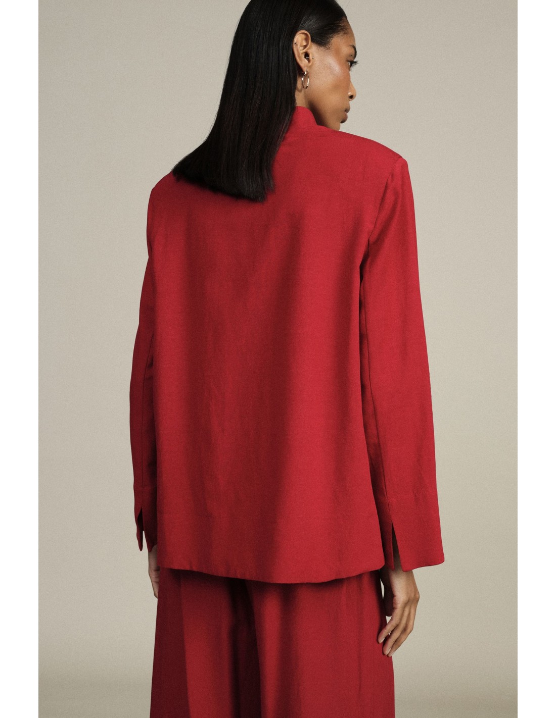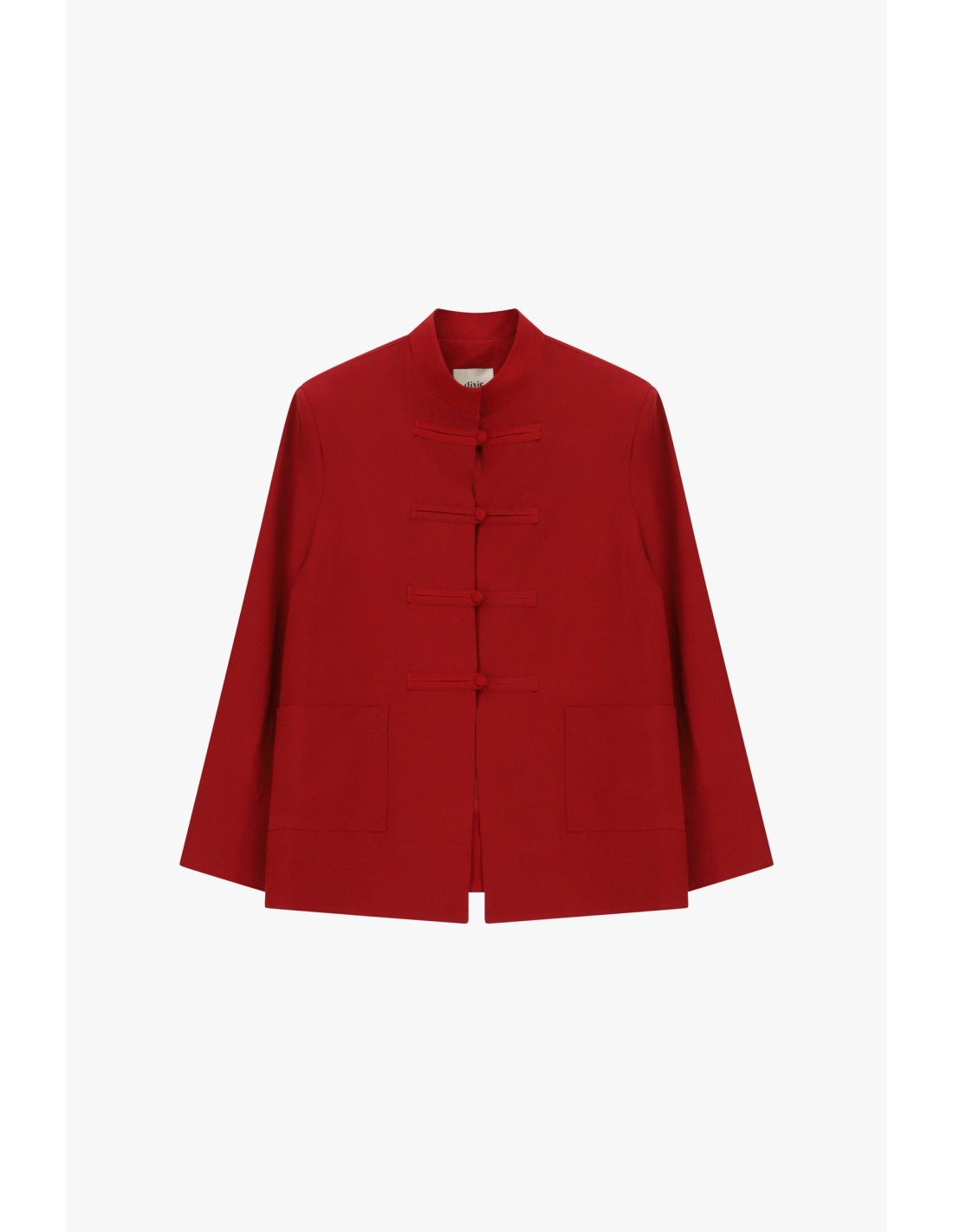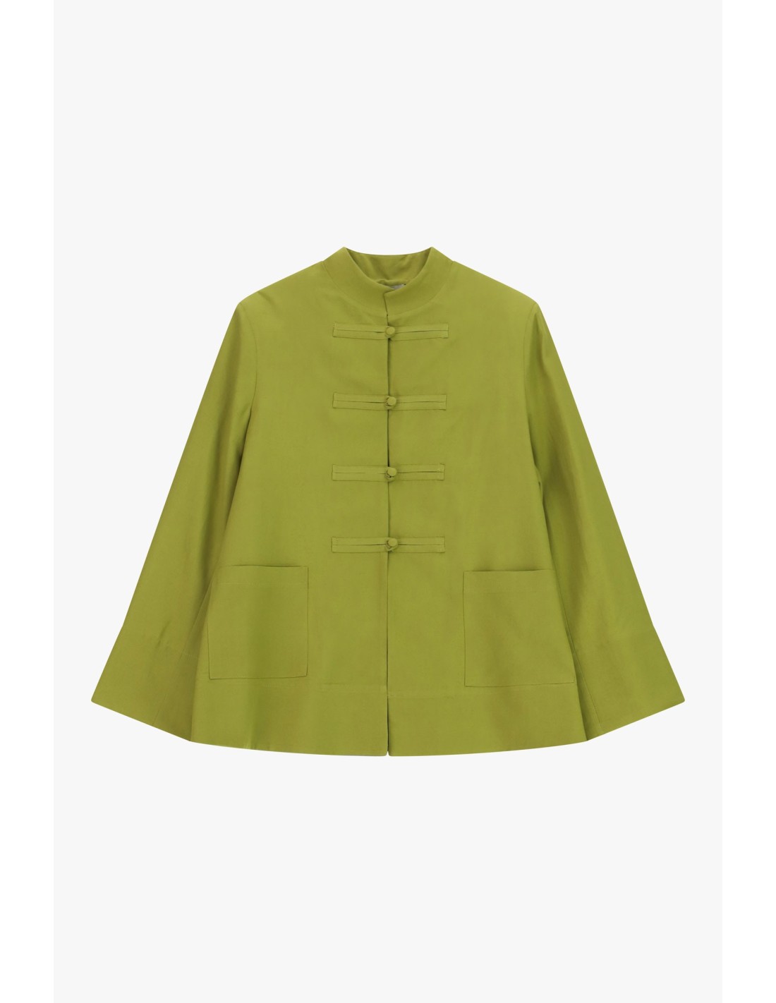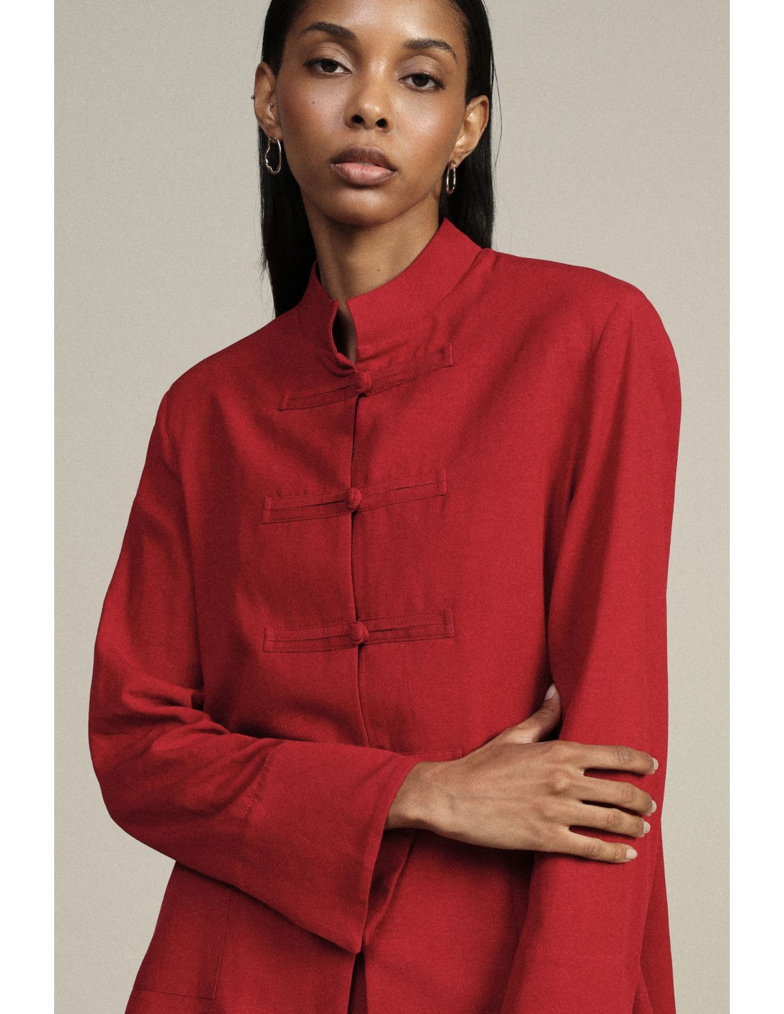 Um casaco exterior de linhas limpas, valorizado por um fecho em nó inspirado no estilo oriental. A gola à coreana e os bolsos aplicados na frente acrescentam um toque original que se adapta aos dias na cidade. Imagine o conforto e a praticidade de o usar com jeans ou calças de corte simples.
