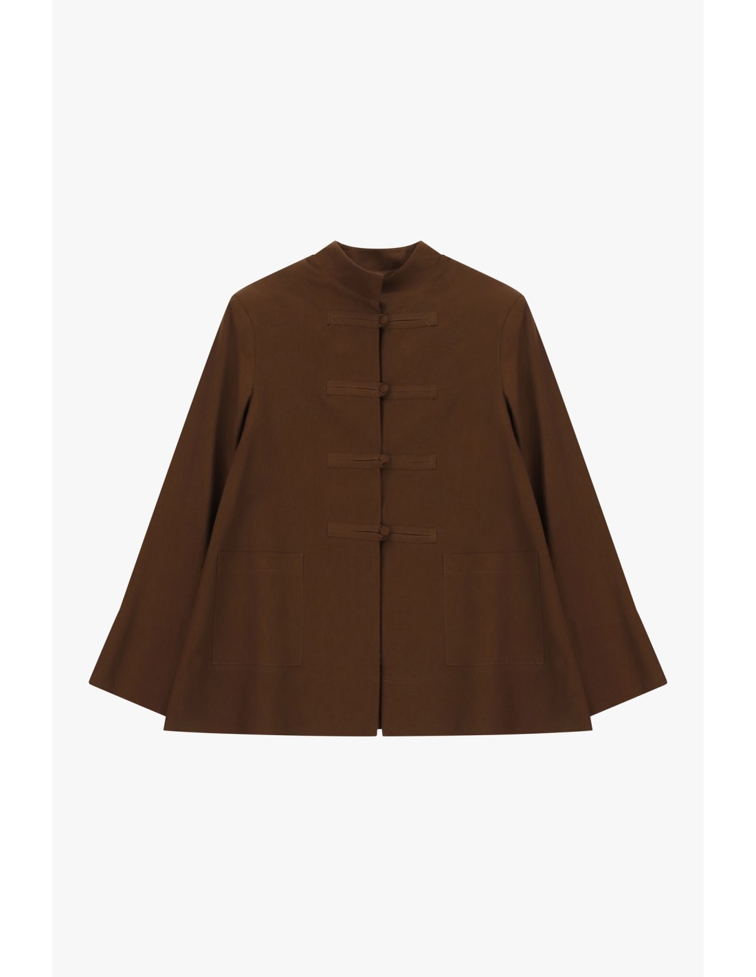 Um casaco exterior de linhas limpas, valorizado por um fecho em nó inspirado no estilo oriental. A gola à coreana e os bolsos aplicados na frente acrescentam um toque original que se adapta aos dias na cidade. Imagine o conforto e a praticidade de o usar com jeans ou calças de corte simples.