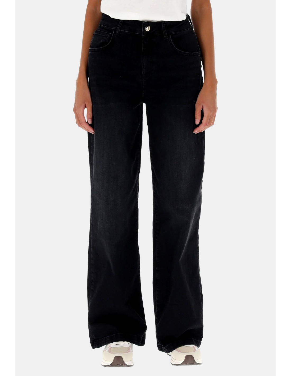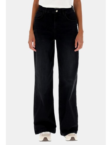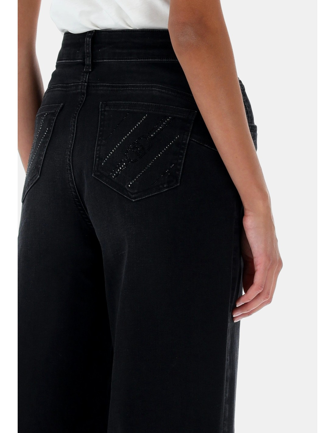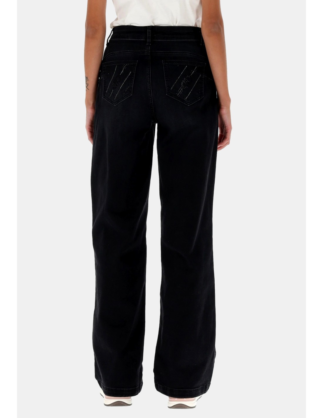 Palazzo denim, cor sólida, cintura regular, apliques de strass nos bolsos traseiros.