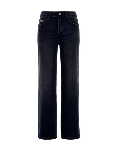Palazzo denim, cor sólida, cintura regular, apliques de strass nos bolsos traseiros.