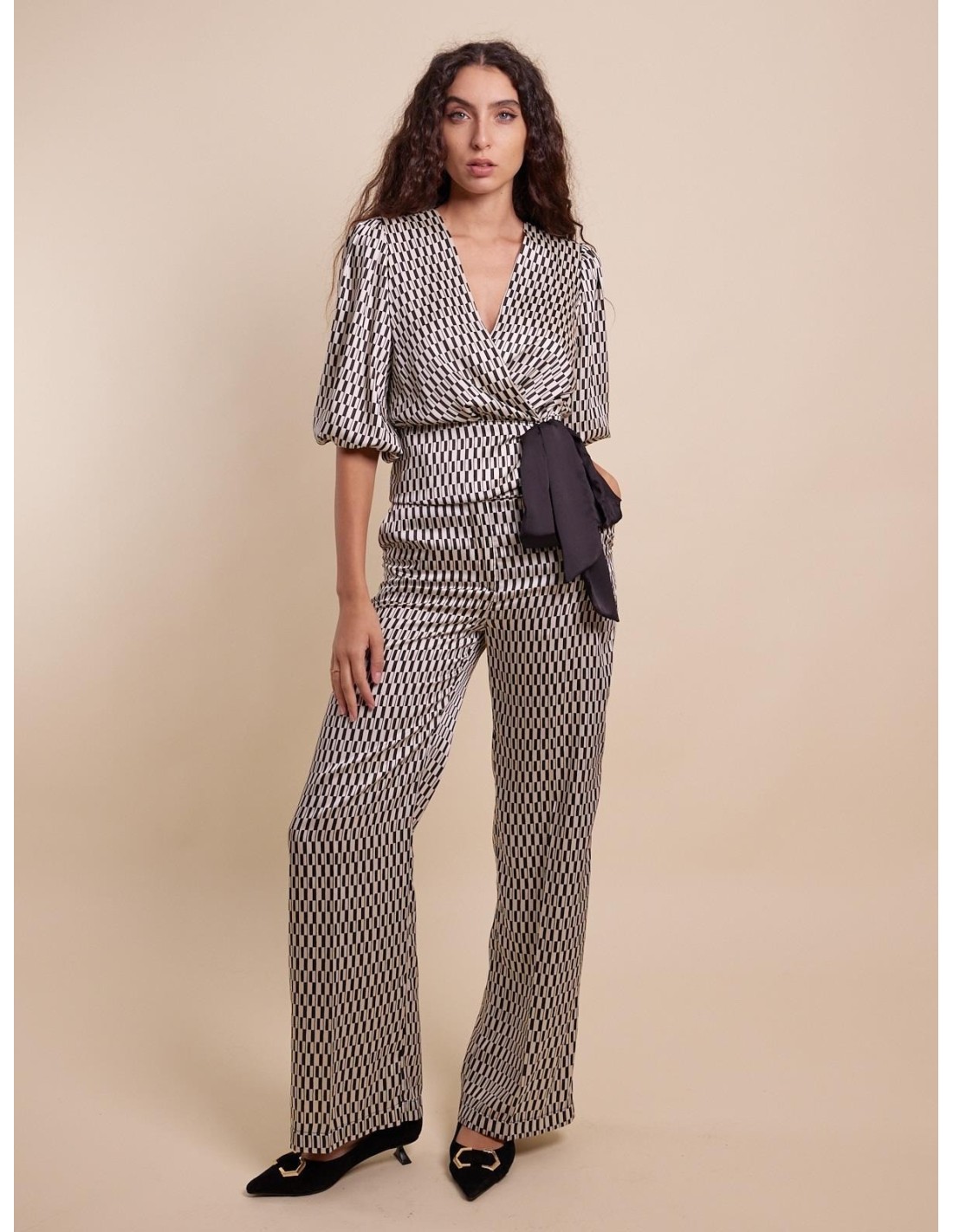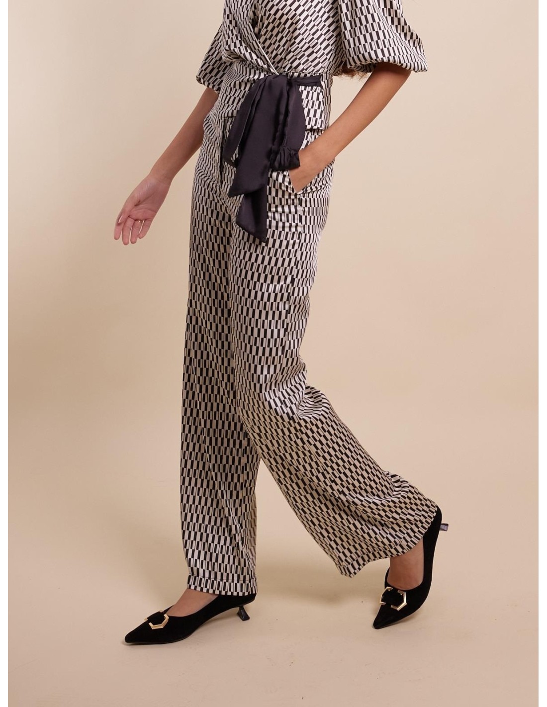 Calças estampadas, modelo palazzo, cintura regular.