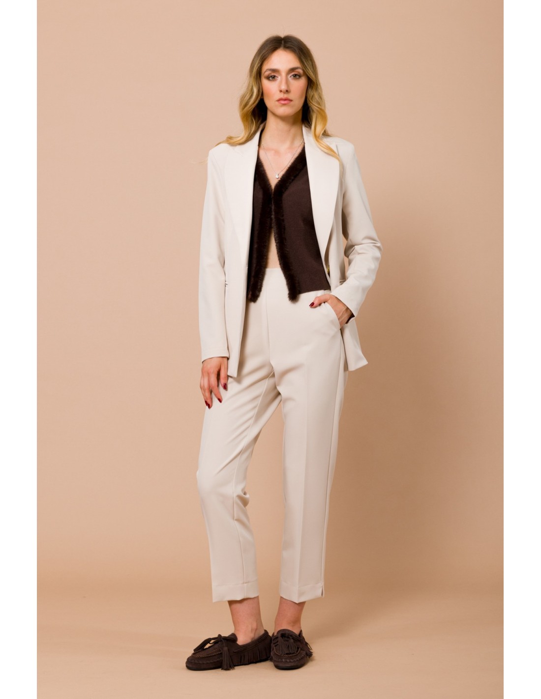 Maryley assina umas calças de corte afunilado e cintura média, confortáveis graças ao elástico posterior. Tecido fluido e compacto, agradável na pele, com vinco passado que alonga a silhueta. Bainha com dobra e bolsos laterais para uma funcionalidade discreta. Perfeito para o escritório e os compromissos do dia a dia.