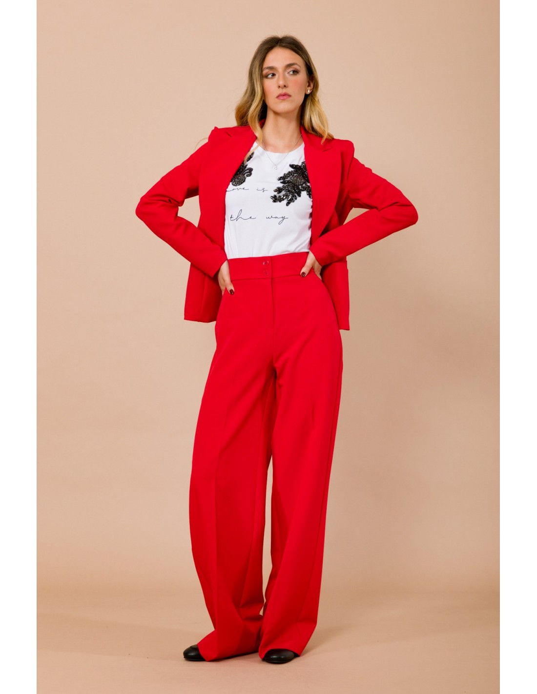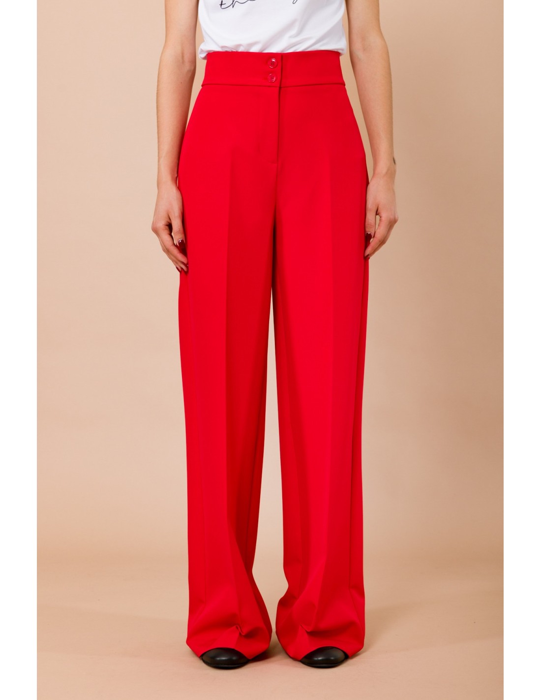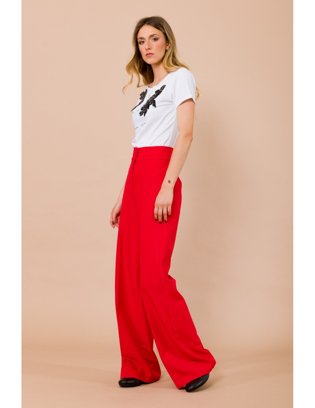 Maryley apresenta calças largas de cintura alta: corte macio e alongado que valoriza a silhueta. Tecido fluido e compacto, confortável ao longo do dia. Detalhes distintivos: fecho duplo com botão e vinco passado na frente; bolsos de vivo na parte de trás. Perfeitas do escritório ao aperitivo, com blazer ou camisola minimal.