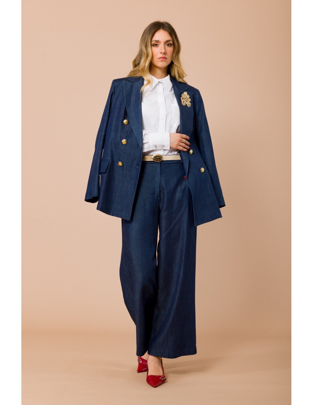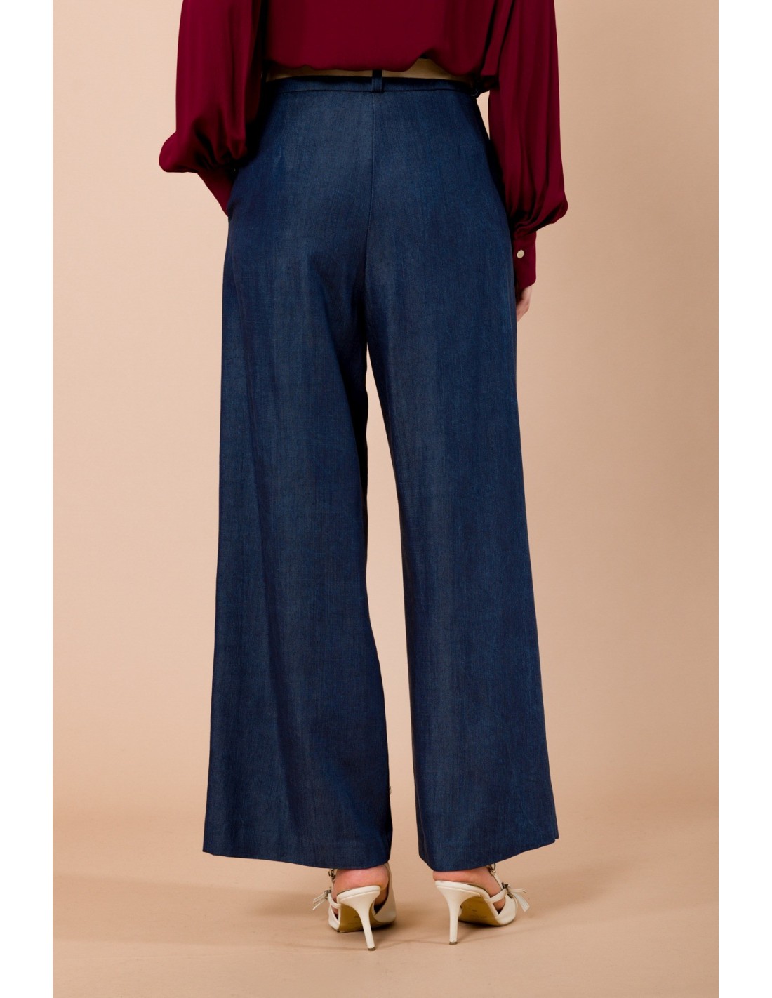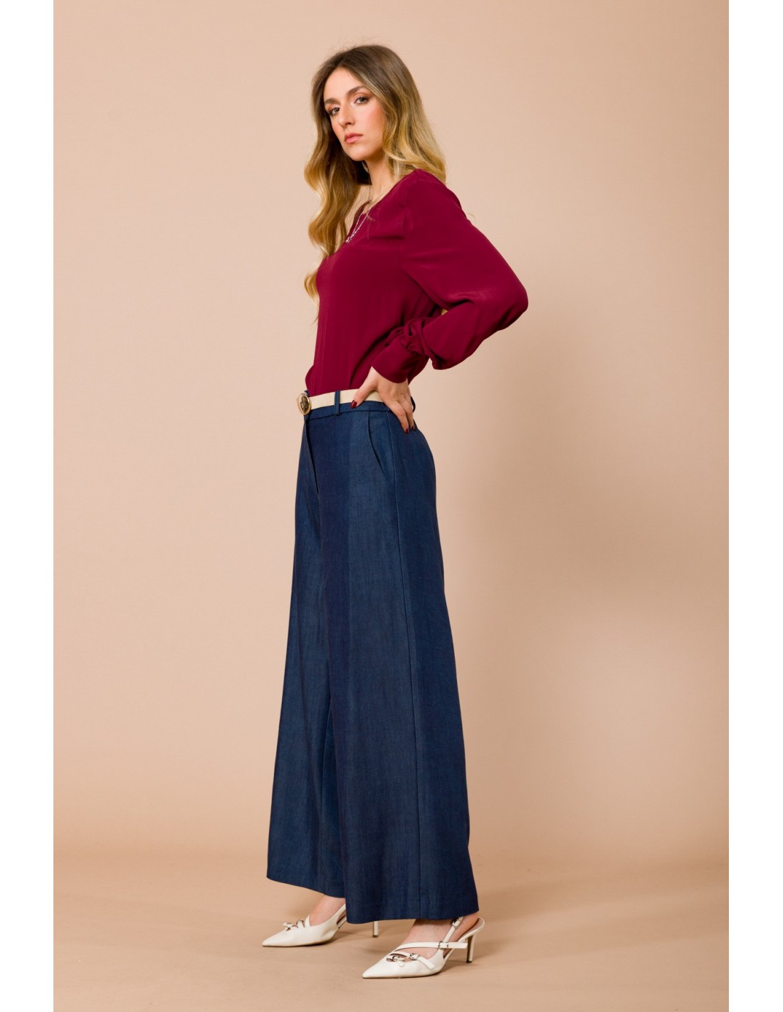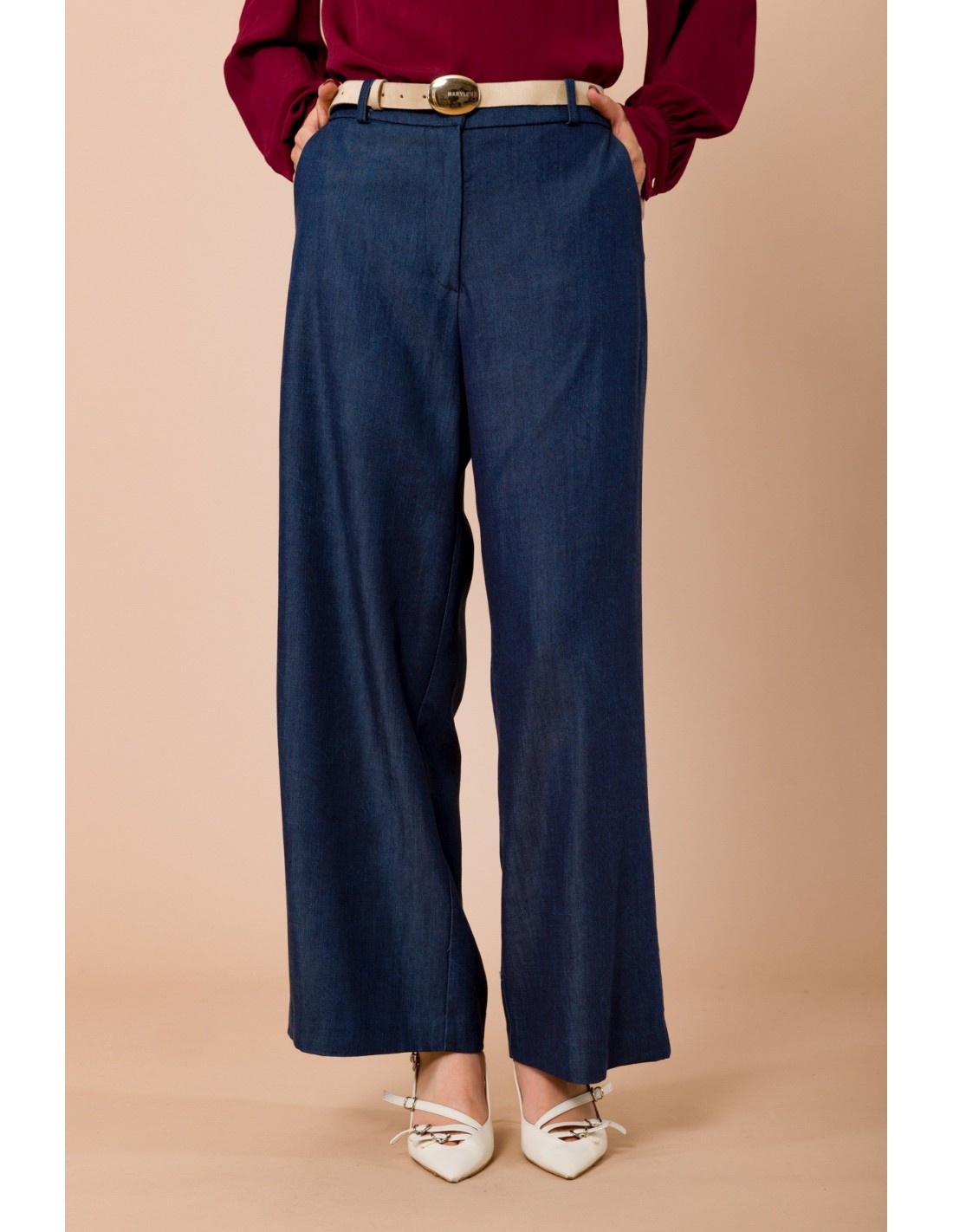 Maryley assina uma calça larga de cintura média: perna fluida que alonga, em denim macio com toque sedoso e conforto durante todo o dia. Cintura em camurça com fivela redonda e prega frontal definem a sua linha. Perfeita do escritório ao aperitivo, combina com blazer ou camisa para uma silhueta impecável.