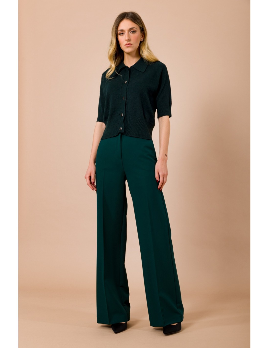 Maryley assina uma calça ampla de perna reta, corte fluido que alonga a silhueta. Confeccionada em tecido técnico macio com toque compacto, proporciona conforto ao longo do dia. Cintura com faixa plana e elástico traseiro invisível, vinco passado e bolsos laterais. Perfeita para escritório e ocasiões smart.