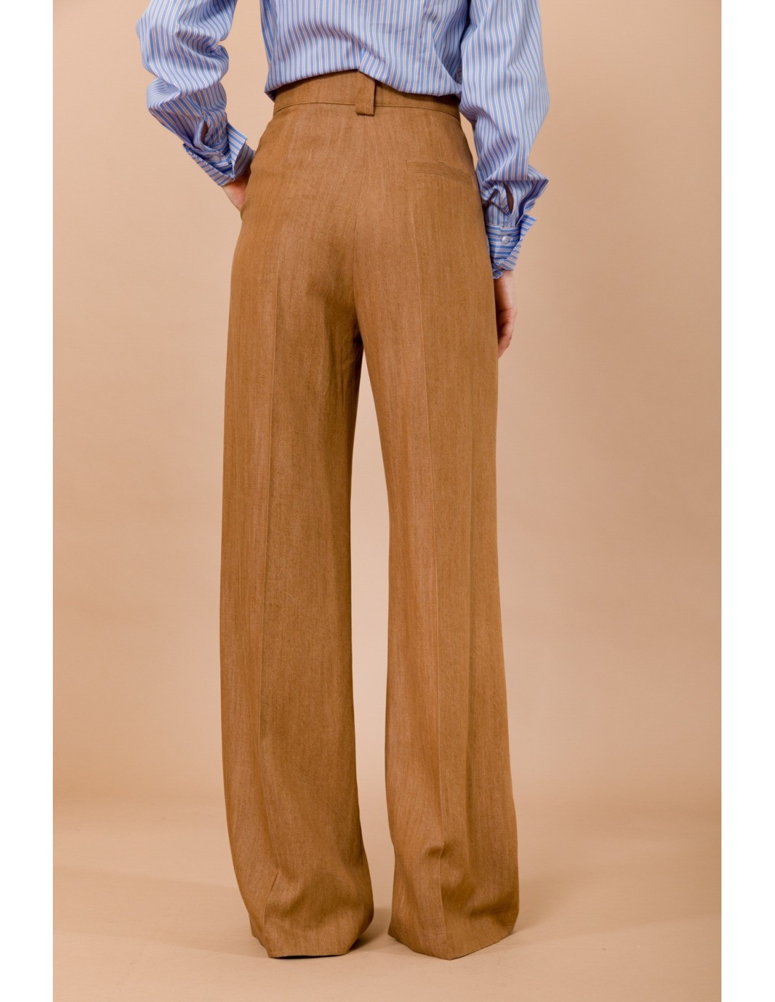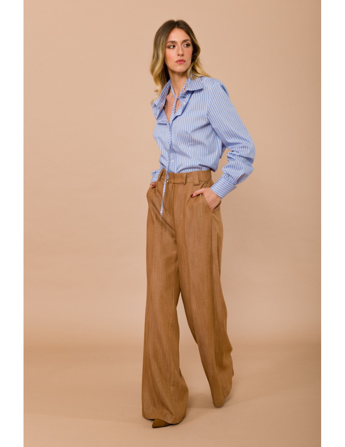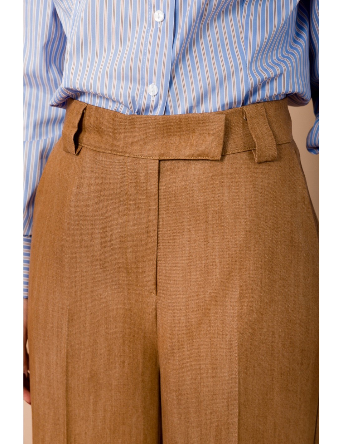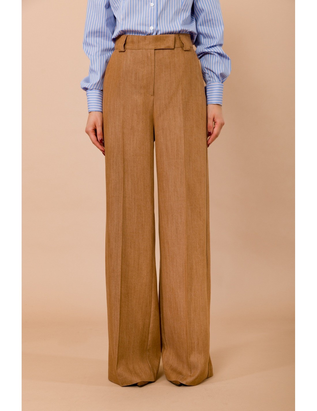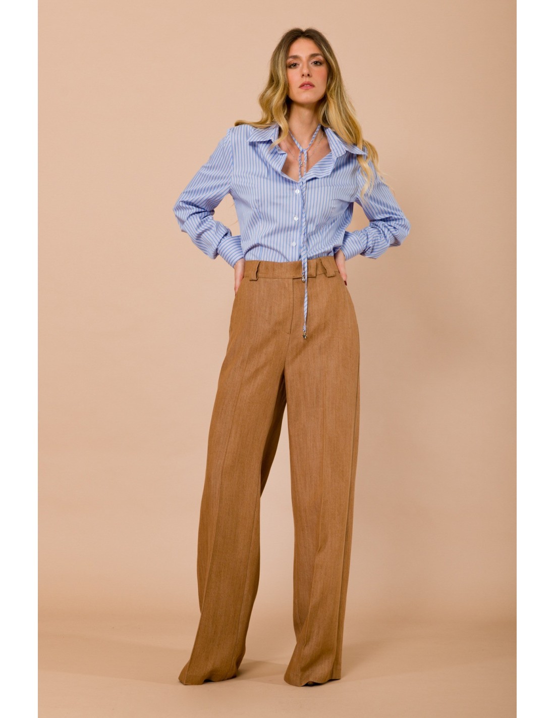 Maryley assina um modelo amplo e fluido, de cintura alta, que realça a silhueta com vinco passado frontal. Tecido macio com efeito lã-linho, confortável durante todo o dia. Passadores largos e bolsos à francesa definem a cintura. Ideal para escritório e aperitivos, combina com camisas ou malhas justas.