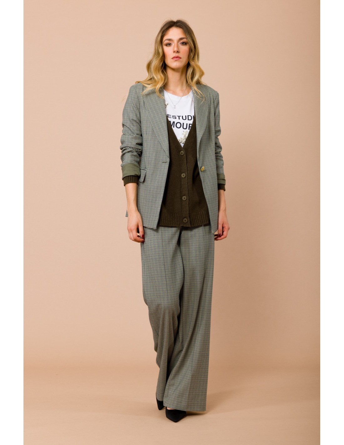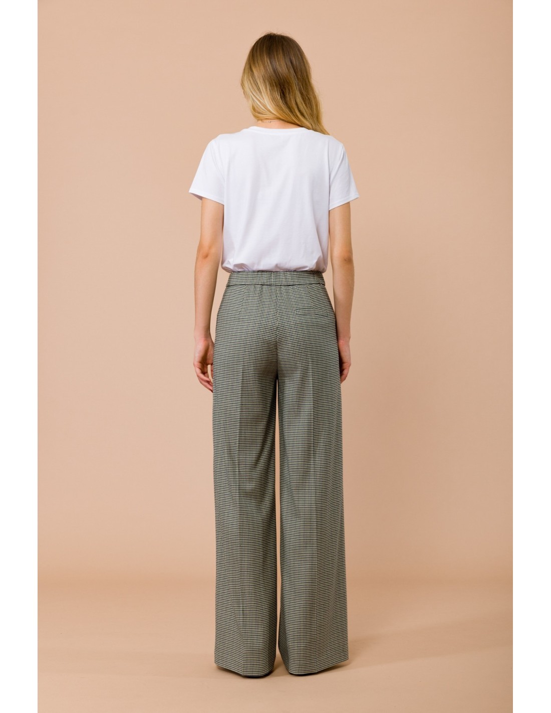 Maryley assina umas calças largas com um corte macio e esguio. Tecido leve em micro pied-de-poule, confortável e fluido. Cintura com elástico na parte de trás para um ajuste que acompanha os movimentos, bolsos à francesa e fecho frontal limpo. Perfeito para o escritório e para o daily chic.