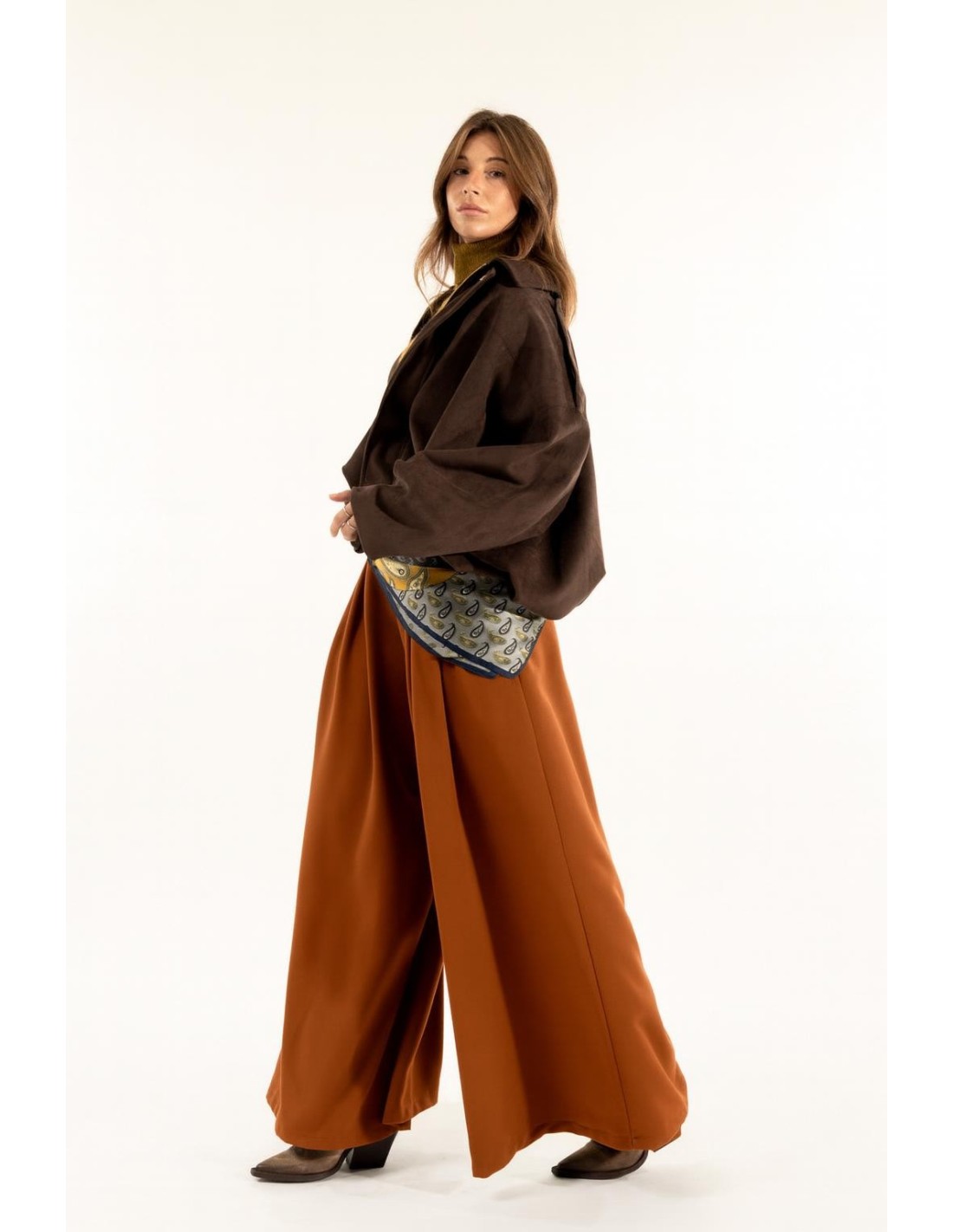 Kontatto assina umas calças largas de cintura média com um caimento fluido e suave. Tecido crepe leve e esvoaçante. Pences frontais para alongar a silhueta, cinto removível com fivela para definir a cintura. Perfeitas do escritório ao aperitivo, com conforto que dura o dia todo.
