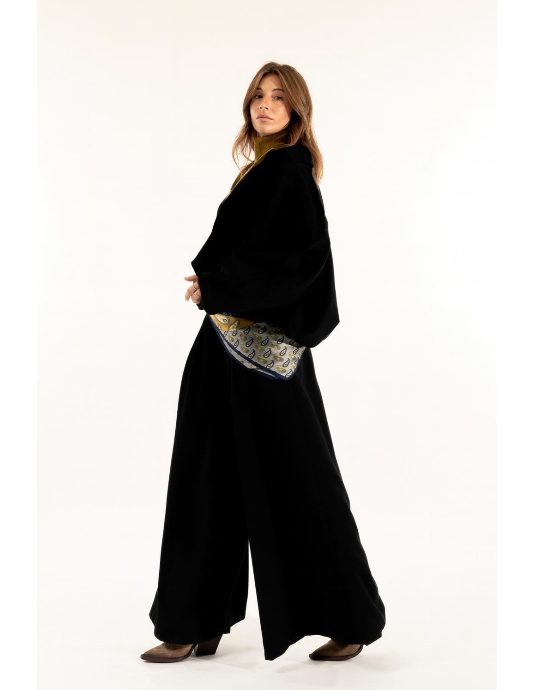 Kontatto assina umas calças largas de cintura média com um caimento fluido e suave. Tecido crepe leve e esvoaçante. Pences frontais para alongar a silhueta, cinto removível com fivela para definir a cintura. Perfeitas do escritório ao aperitivo, com conforto que dura o dia todo.