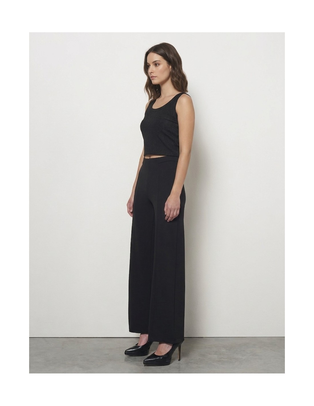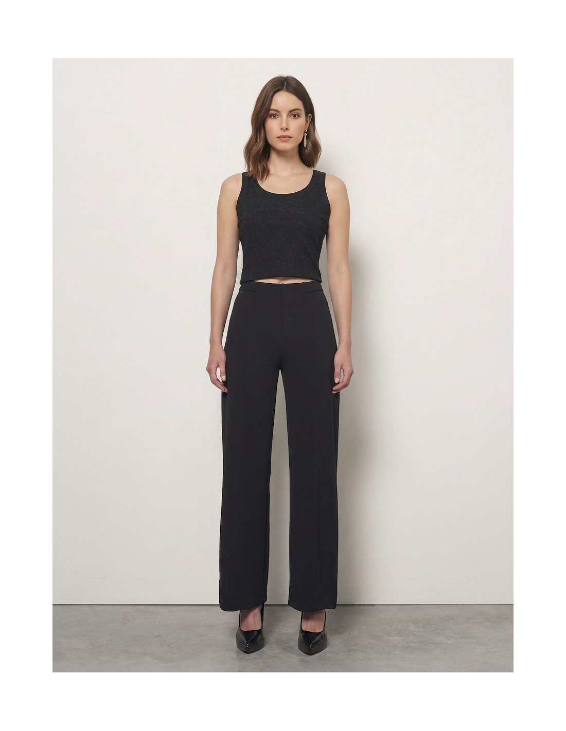 Corte a perna larga e cintura alta, pensado para alongar a silhueta com um ajuste fluido e confortável. O tecido compacto e macio acompanha os movimentos, enquanto as costuras frontais e os bolsos embutidos acrescentam um toque de alfaiataria. Perfeito para escritório, dia a dia e looks city-chic.