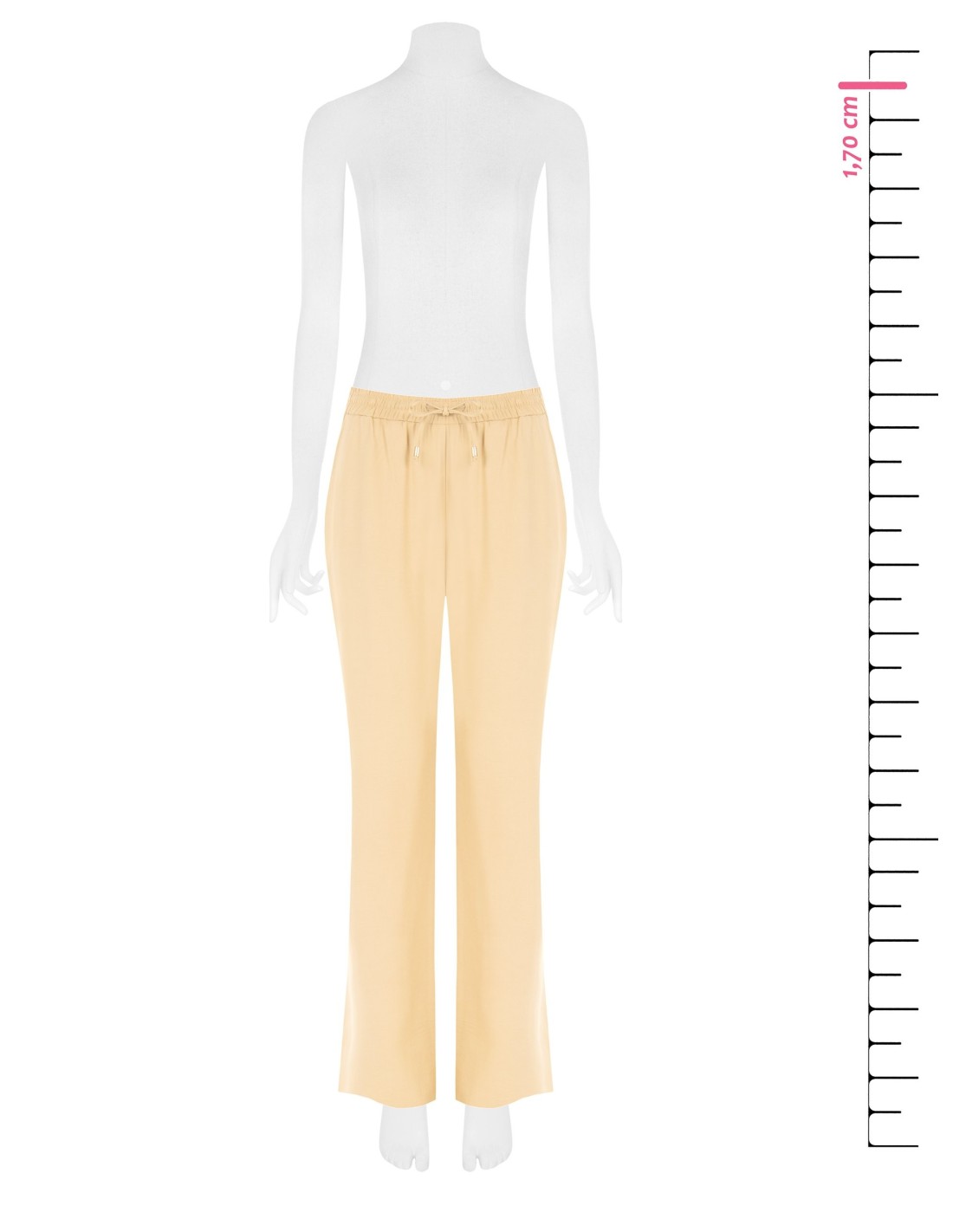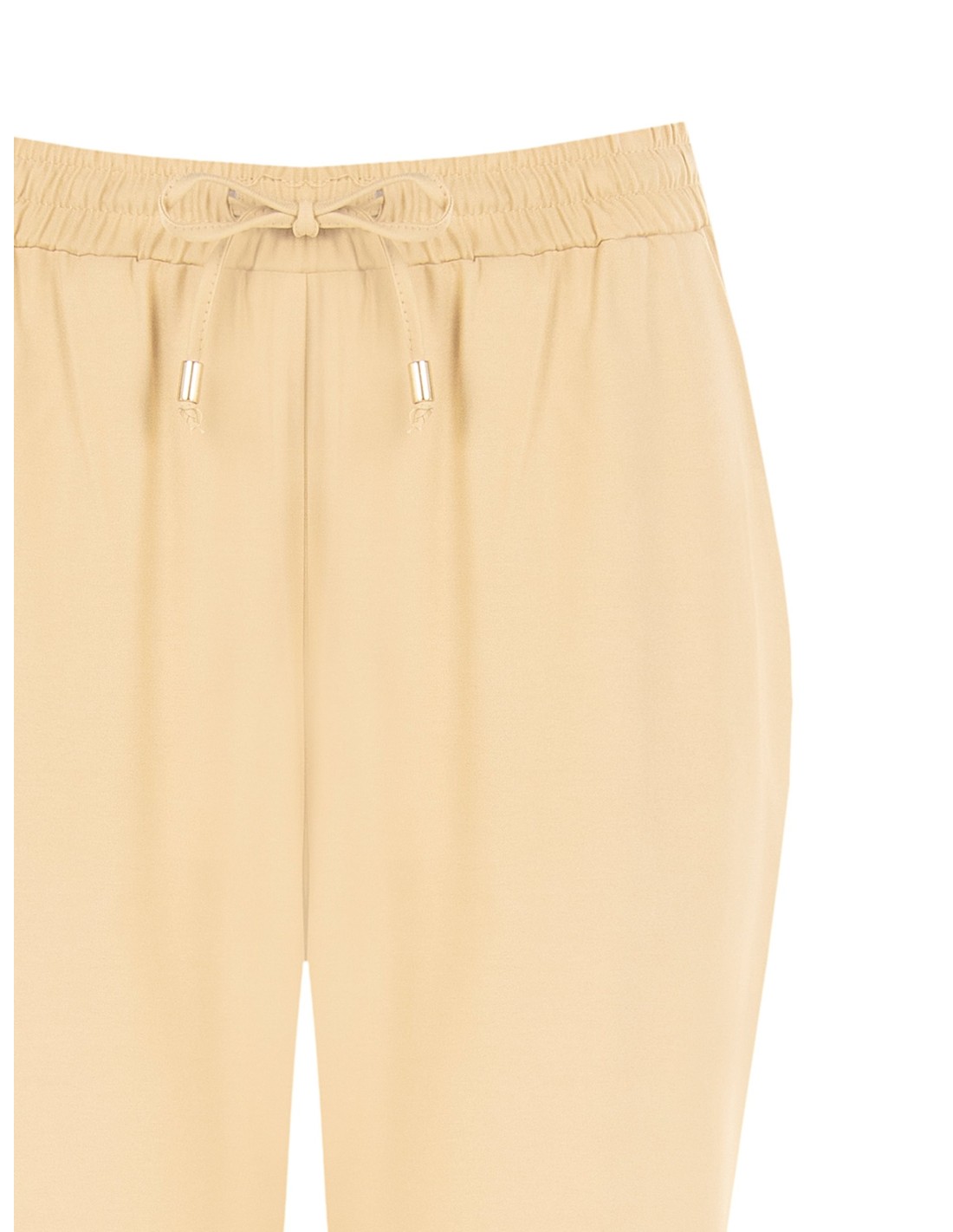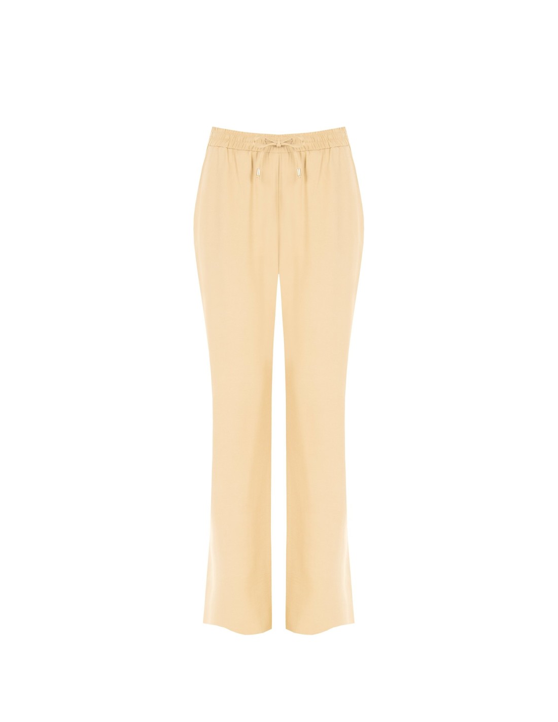 Linha fluida com corte confortável, com perna direita ligeiramente evasada que alonga a silhueta. Confeccionada em tecido macio e fluido, apresenta cintura elástica e cordão com ponteiras metálicas. Perfeita do escritório ao tempo livre, para looks versáteis e cuidados.