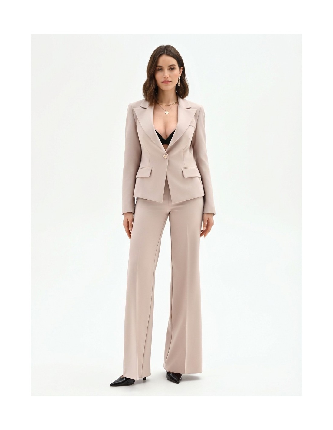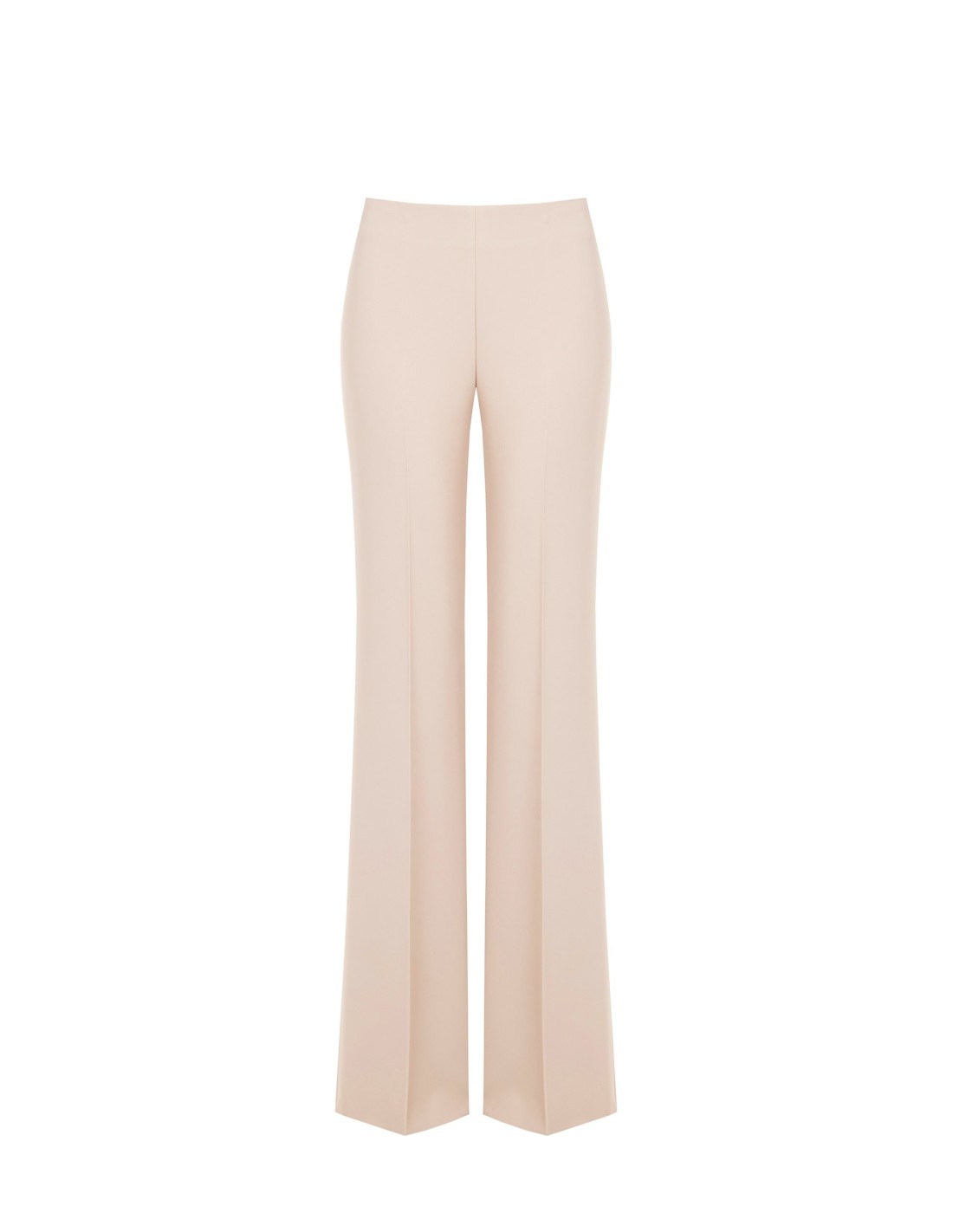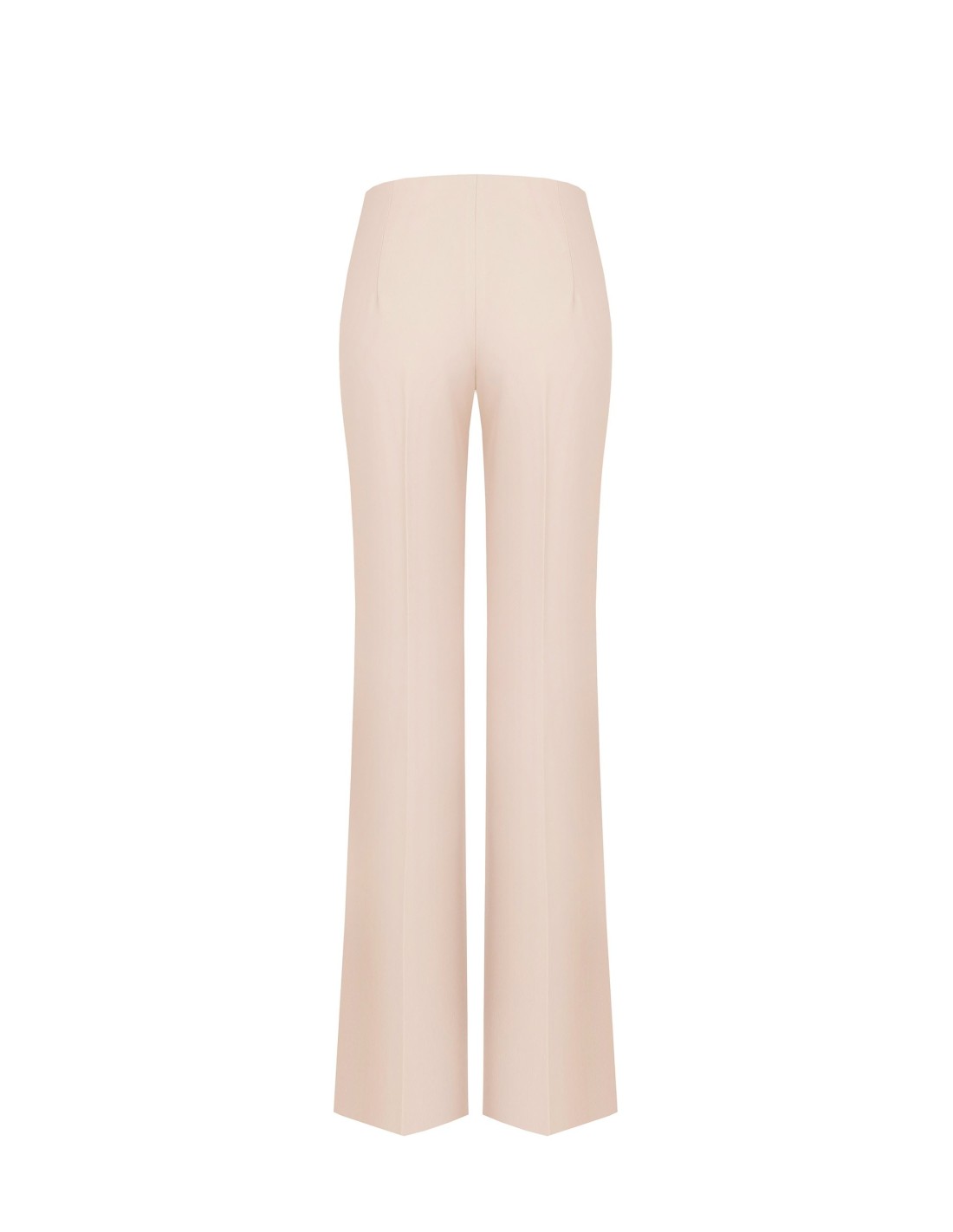 Linha com cintura médio‑alta e perna macia evasé que alonga a silhueta. Confeccionado em tecido fluido e ligeiramente stretch, com vinco frontal passado e acabamentos limpos sem fechos à vista. Perfeito do escritório ao aperitivo, com blazer ou blusa de seda.