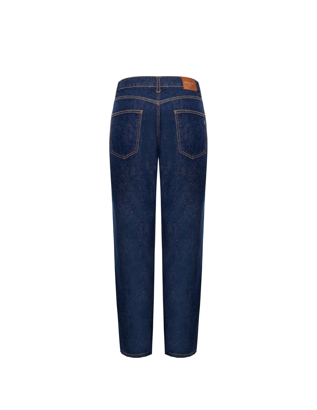 Linha reta e cintura regular valorizam a silhueta com conforto descontraído. Confeccionado em denim compacto mas macio, com costuras contrastantes e botão metálico com logótipo. Os cinco bolsos tornam-no prático e versátil, perfeito do escritório ao fim de semana.