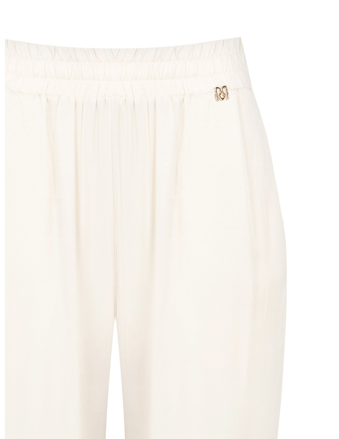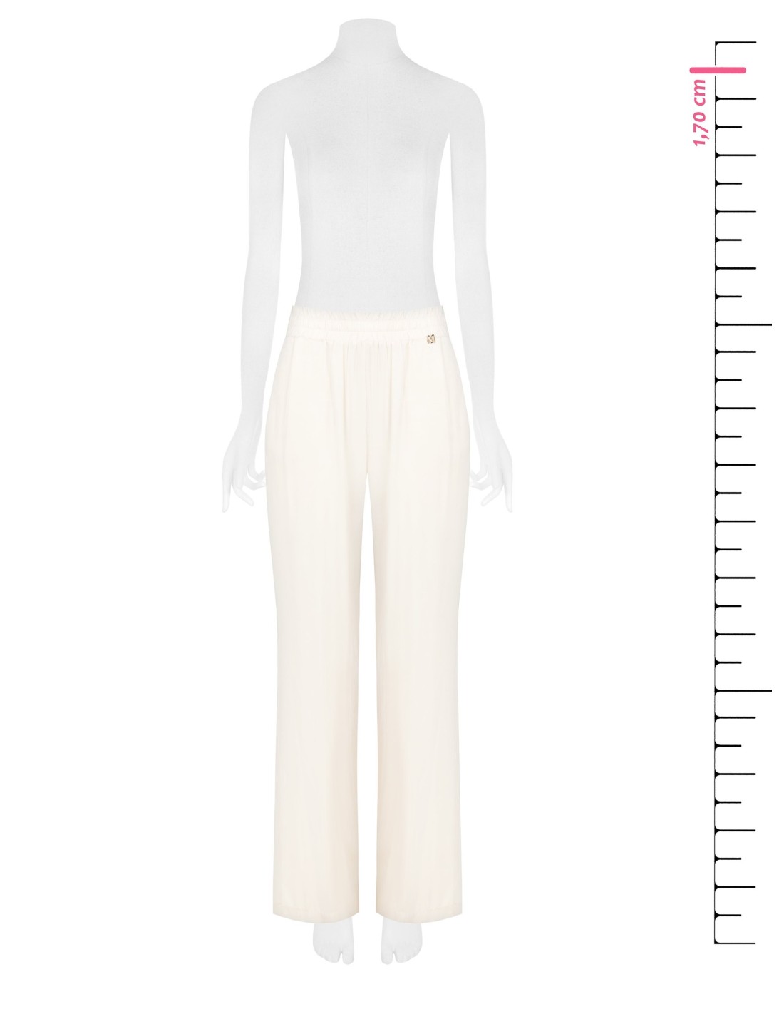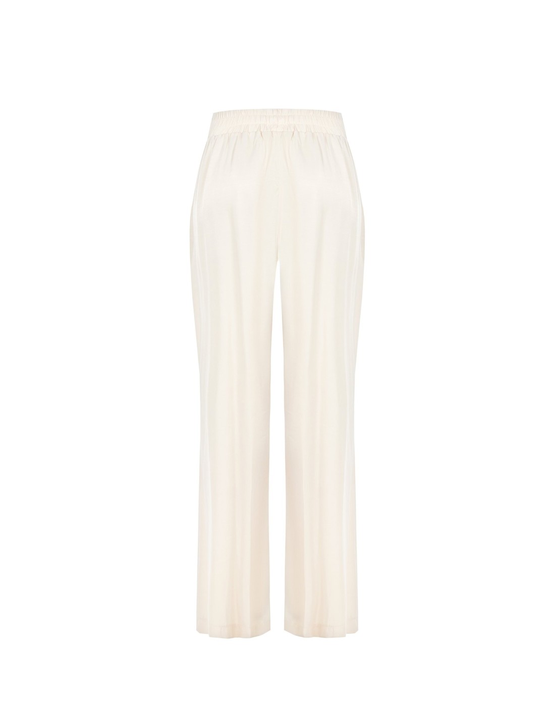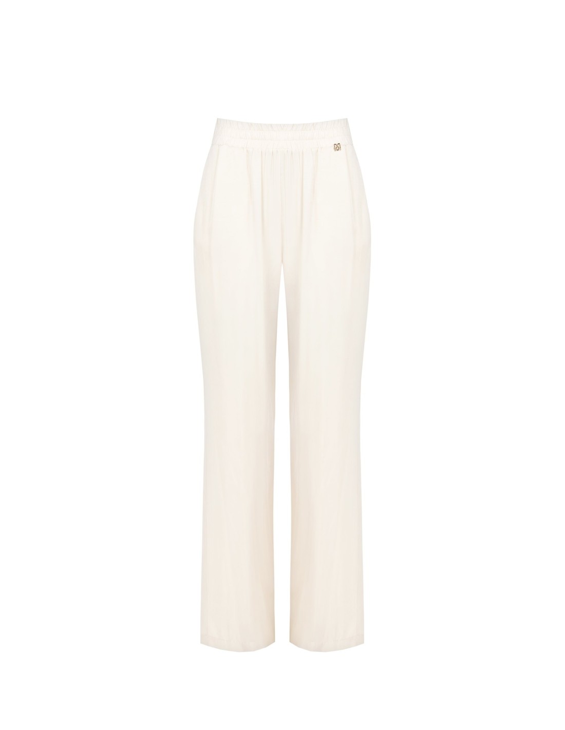 Silhueta ampla e fluida em tecido leve de toque macio, com cintura totalmente elástica que envolve sem apertar. Os bolsos laterais e o logótipo metálico na cintura acrescentam um toque chic. Perfeito do escritório ao lazer, também com sandálias rasas ou saltos.