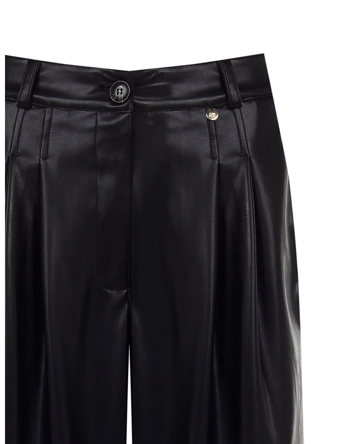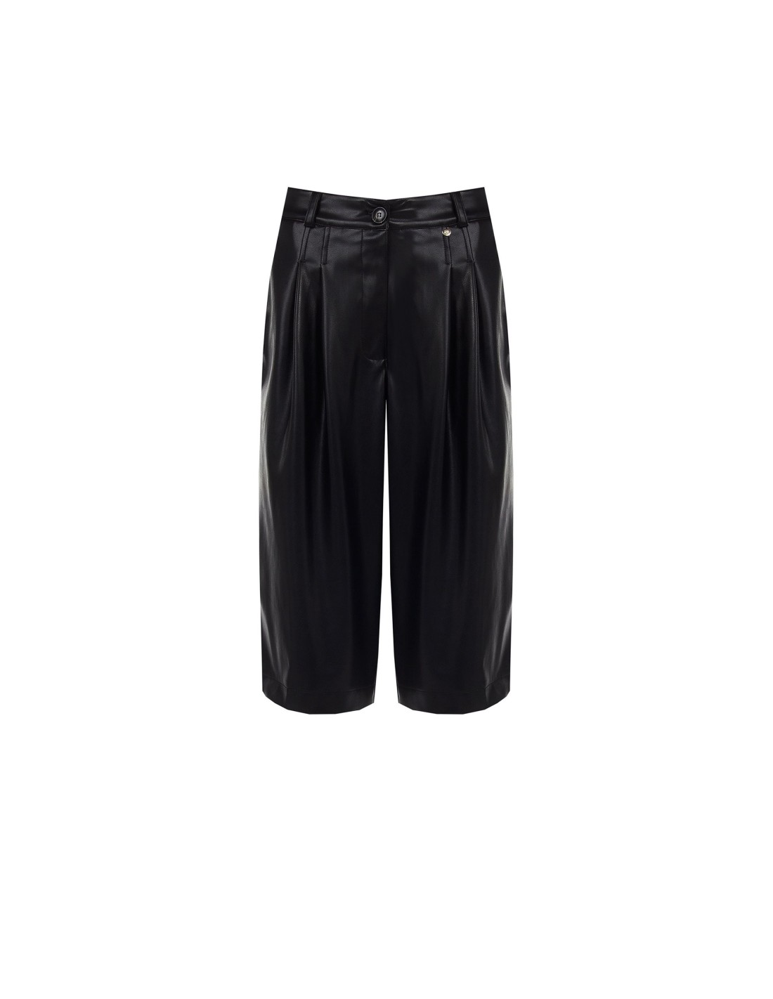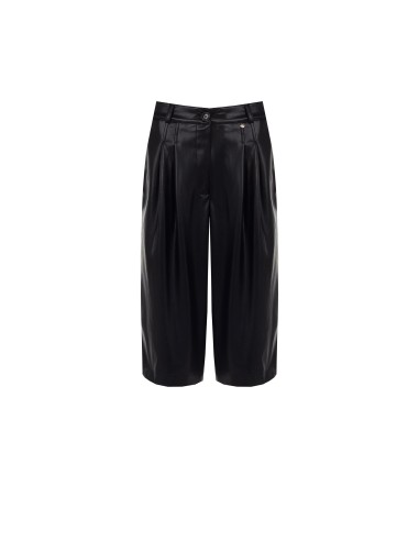 Culotte de cintura média com ajuste suave e perna larga à altura da canela, desenha uma silhueta fluida e contemporânea. Fabricada em ecopele macia de toque sedoso. Prega frontal e botão com logo acrescentam carácter, passadores para cinto para modular o look. Perfeita do escritório ao aperitivo.