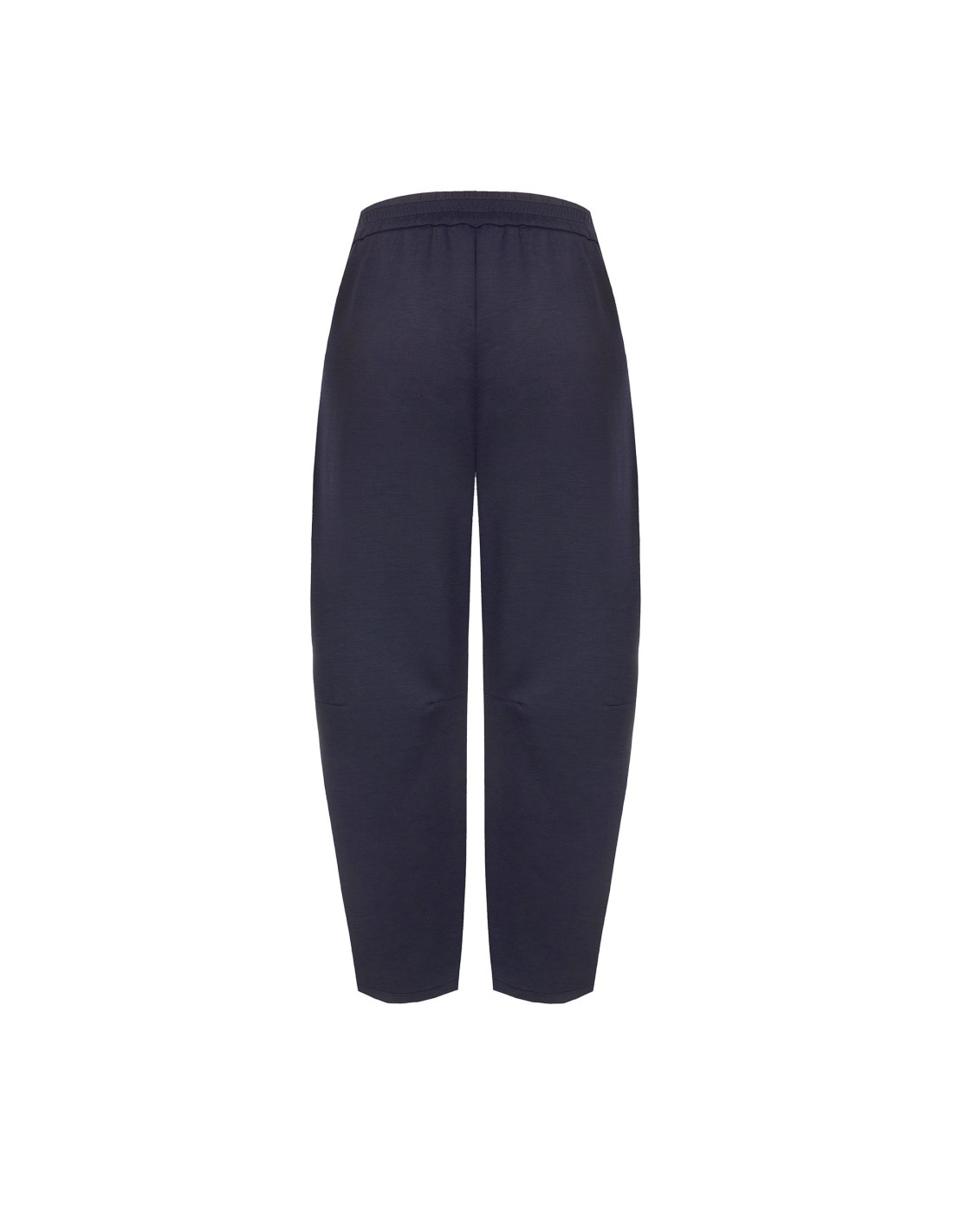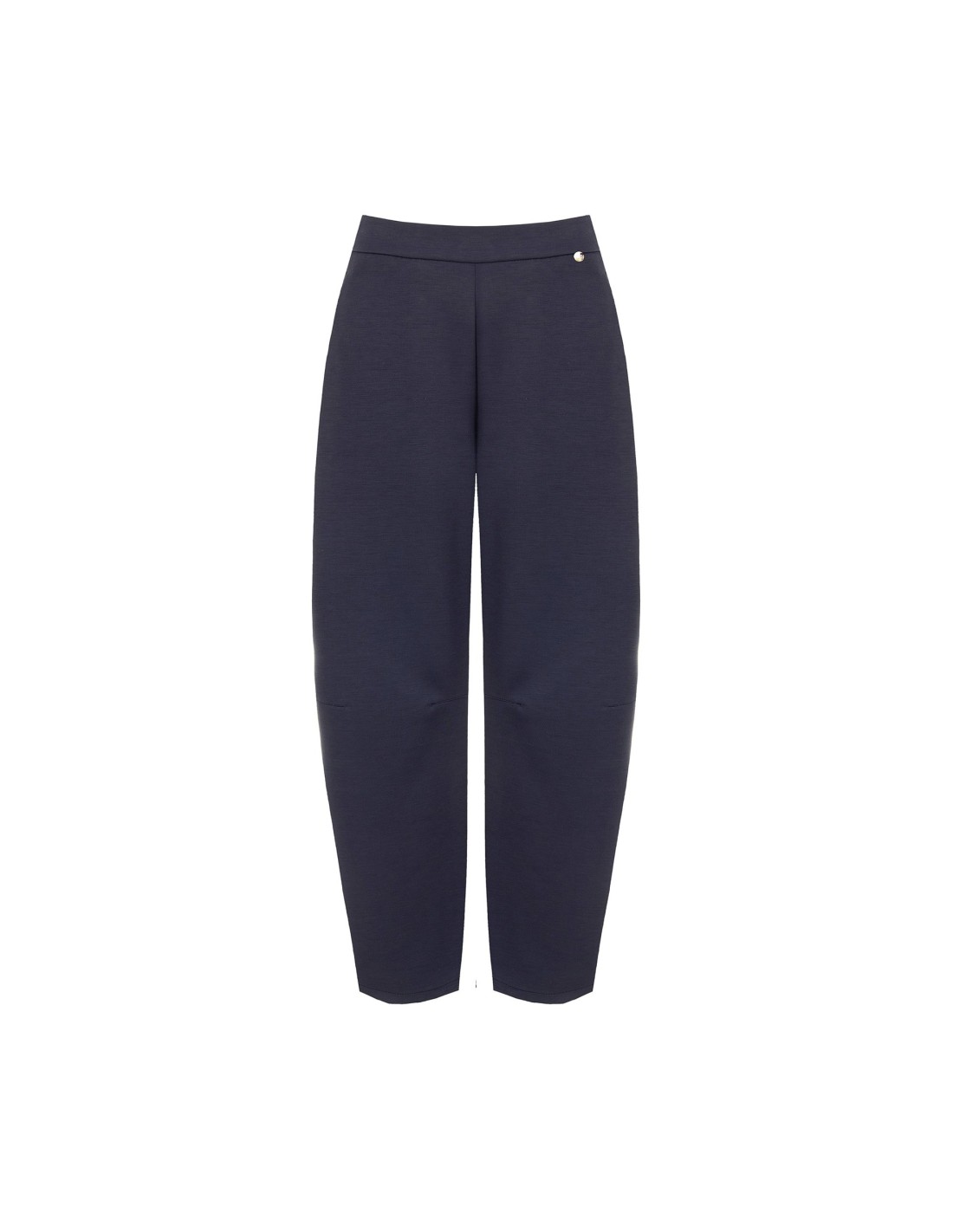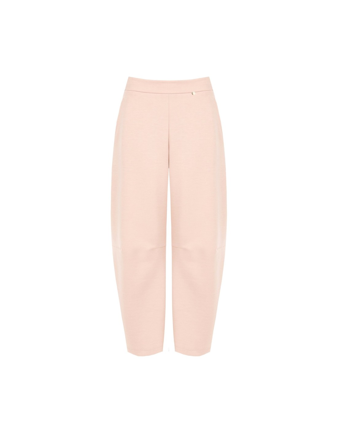 Modelo de perna suave com corte carrot que alonga a silhueta, confeccionado em jersey fluido e confortável. Cós liso à frente e elástico na parte de trás para um ajuste impecável, enriquecido com micro-charm metálico. Perfeito do escritório ao tempo livre.