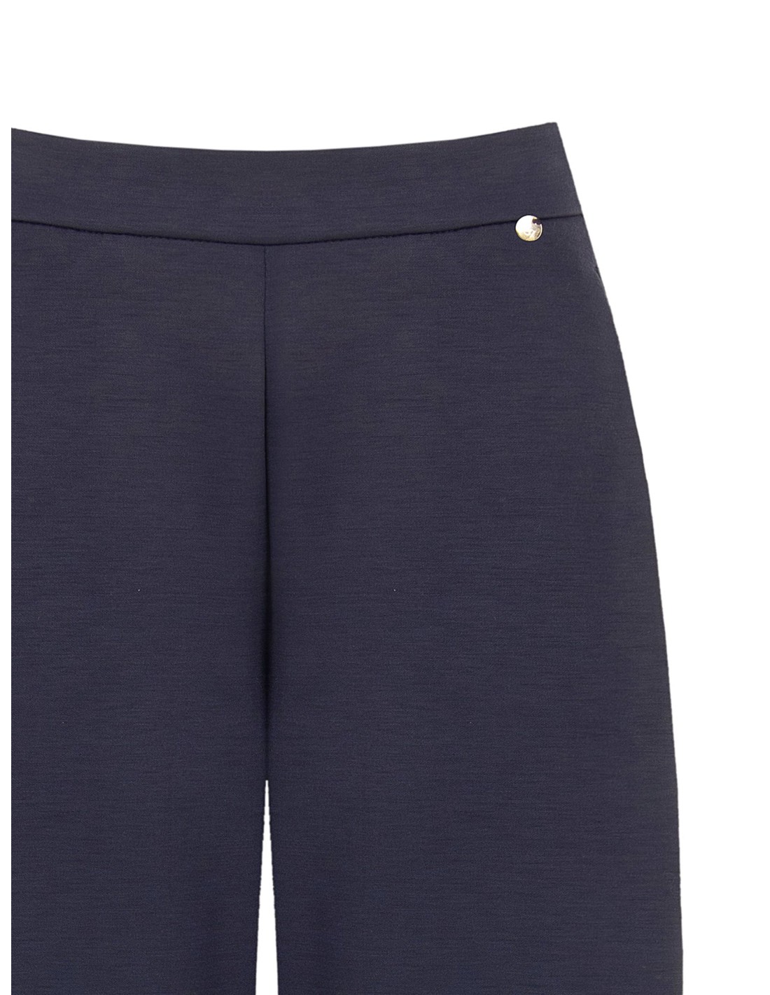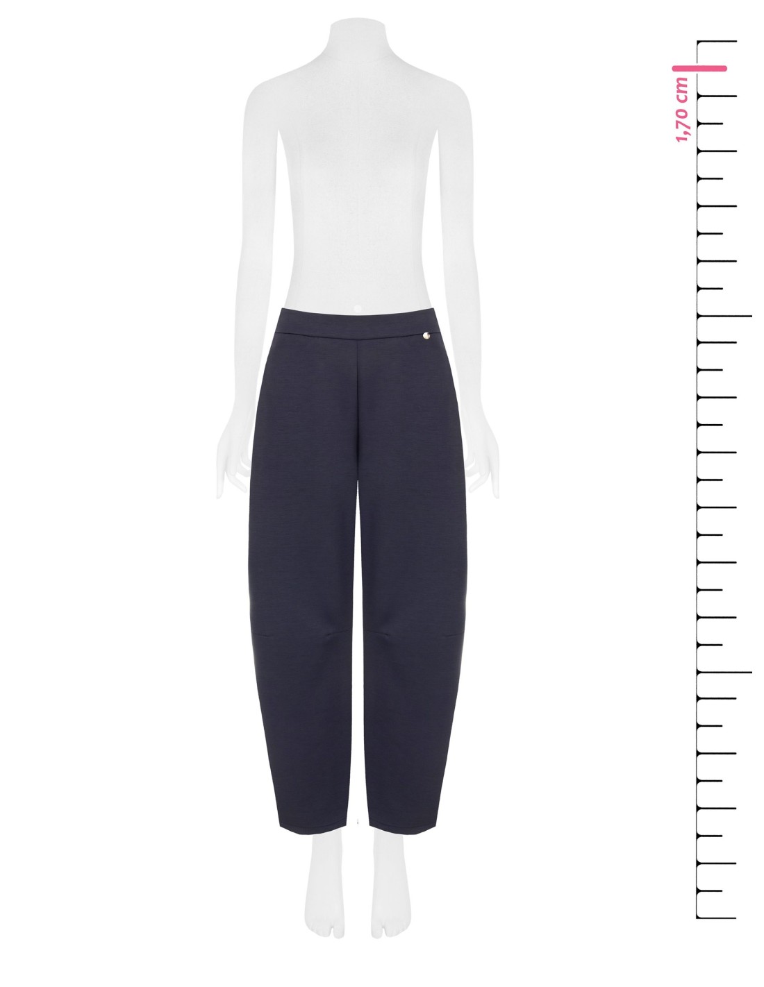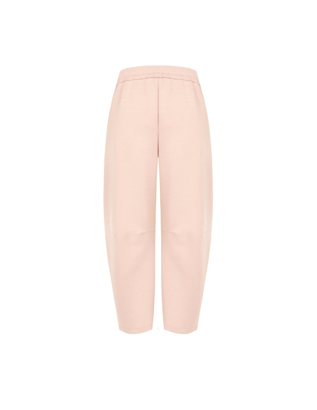 Modelo de perna suave com corte carrot que alonga a silhueta, confeccionado em jersey fluido e confortável. Cós liso à frente e elástico na parte de trás para um ajuste impecável, enriquecido com micro-charm metálico. Perfeito do escritório ao tempo livre.