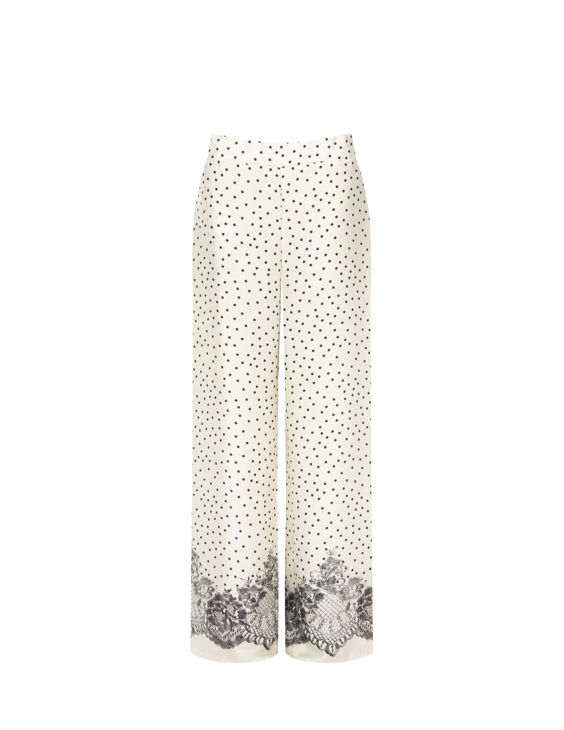 Corte palazzo com caimento fluido e que alonga, em tecido leve com toque sedoso. A faixa na cintura realça a silhueta, enquanto a estampa de bolinhas e a barra com motivo em renda acrescentam um toque refinado. Perfeito do escritório ao aperitivo, com conforto e estilo em qualquer momento.
