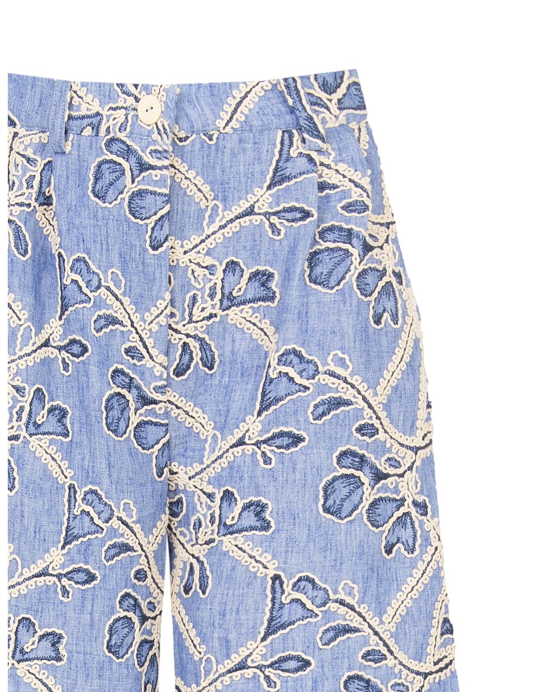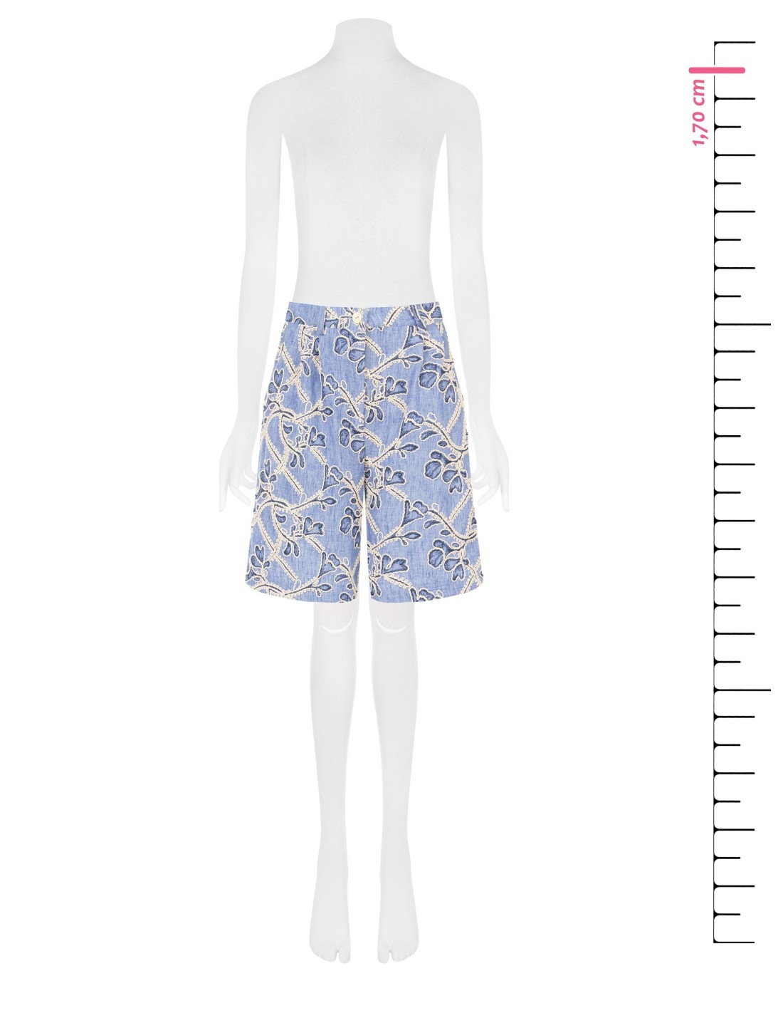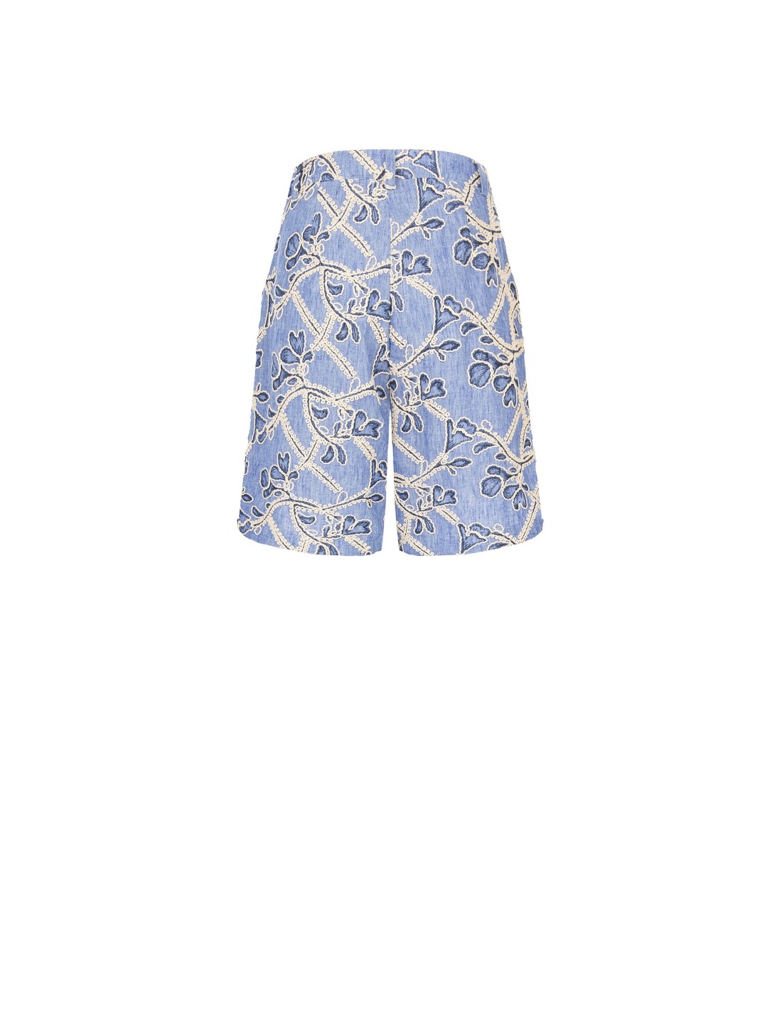 Bermuda de cintura alta com corte amplo e fluido, pensada para alongar a silhueta com conforto. O tecido com efeito ganga é enriquecido com bordados florais em relevo, enquanto vinco frontal e fecho com botão acrescentam um toque cuidado. Perfeito para o chique do dia a dia e para o escritório.