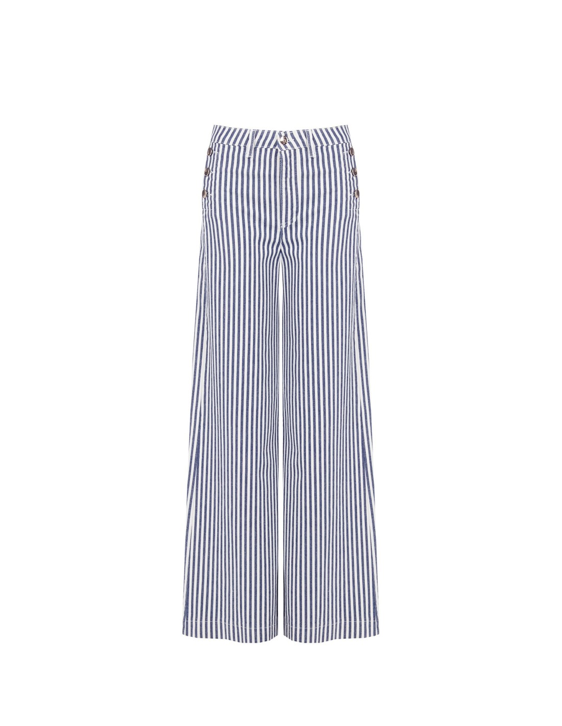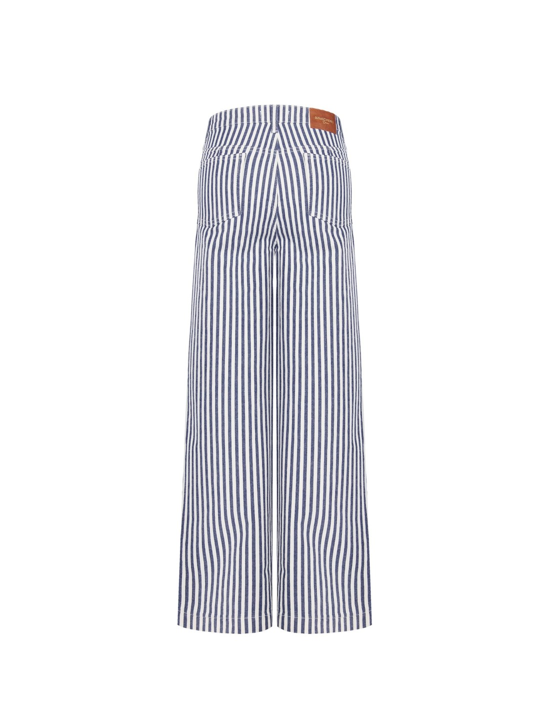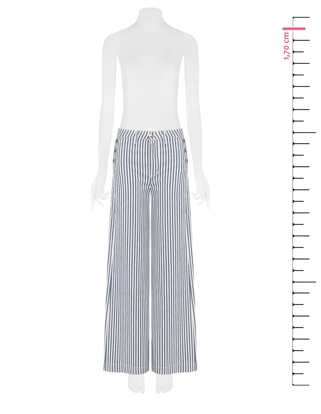 Linha ampla e fluida para este modelo com um corte que alonga a silhueta com conforto natural. Em tecido efeito ganga às riscas, é rematado com fecho de correr e botão e pormenores de botões laterais. Perfeito para o escritório, para o tempo livre e para looks do dia a dia mais cuidados.